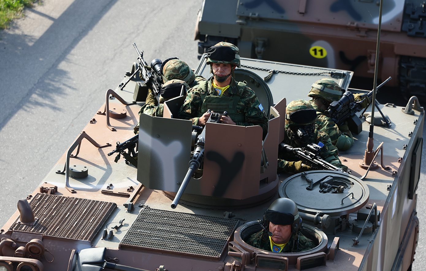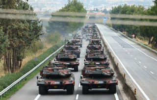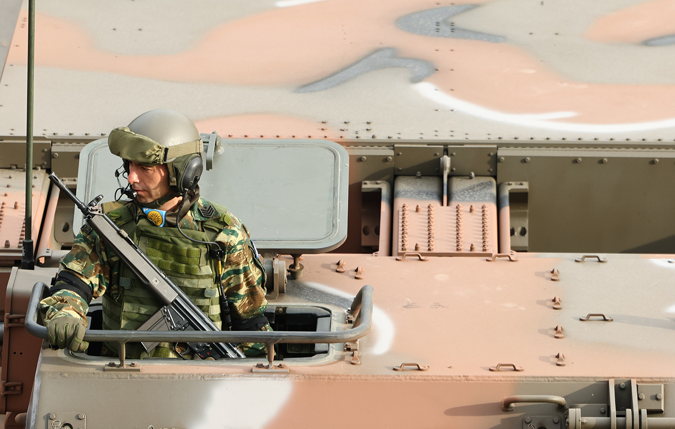 Άρματα μάχης και οχήματα του Ελληνικού Στρατού, περιπολικά και μοτοσικλέτες της Ελληνικής Αστυνομίας καθώς και υδροφόρα οχήματα της Πυροσβεστικής, πραγματοποιούν διελεύσεις σε σχηματισμό κάνοντας την καθιερωμένη πρόβα για την παρέλαση της 28ης Οκτωβρίου στην παραλιακή λεωφόρο Μεγάλου Αλεξάνδρου, στη Θεσσαλονίκη.