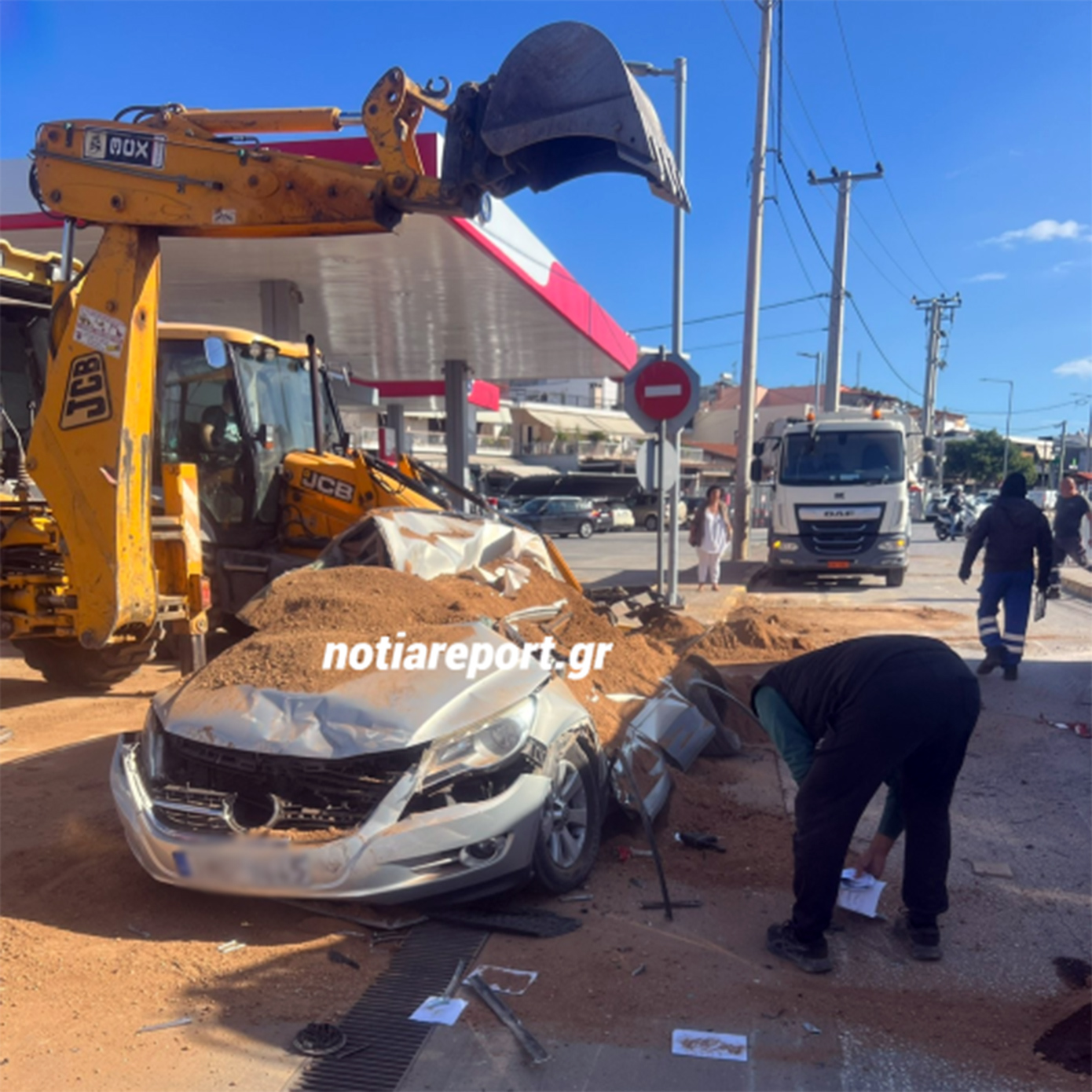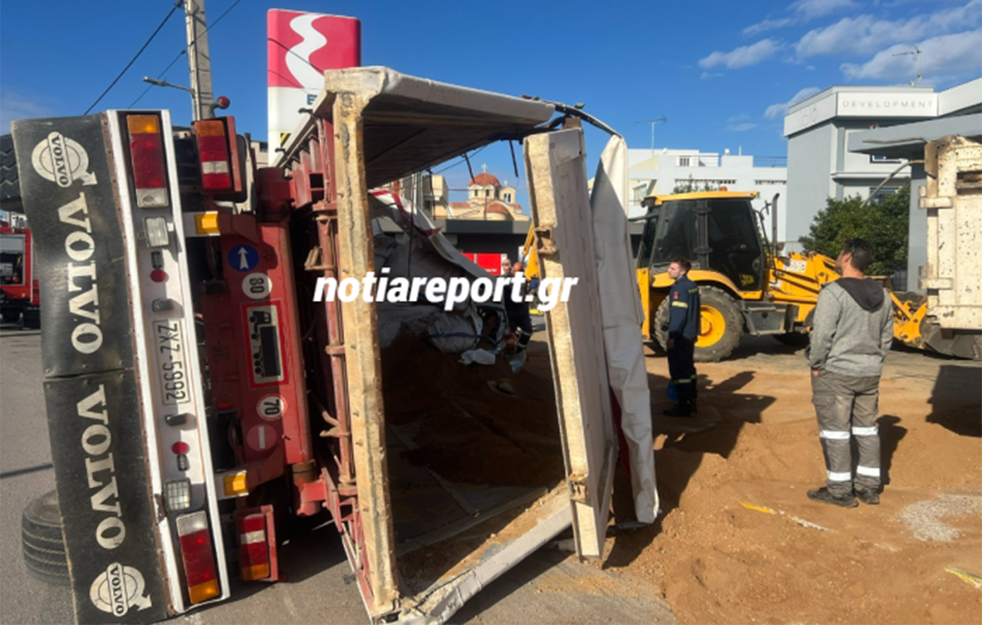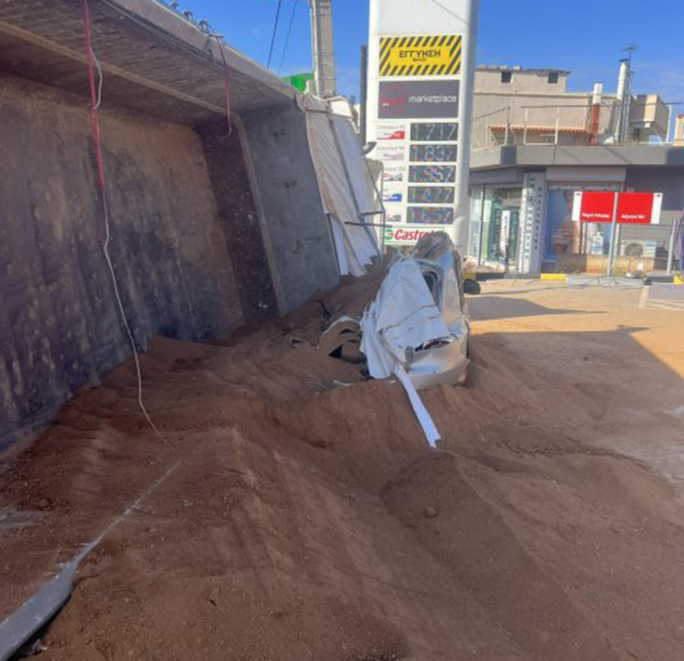 Εικόνες που ήρθαν στο φως της δημοσιότητας αποτυπώνουν το μέγεθος του ατυχήματος, με την νταλίκα που μετέφερε σακιά με χώμα να έχει ανατραπεί και να έχει πέσει πάνω σε σταθμευμένο όχημα, λίγα μόλις μέτρα από πρατήριο υγρών καυσίμων.