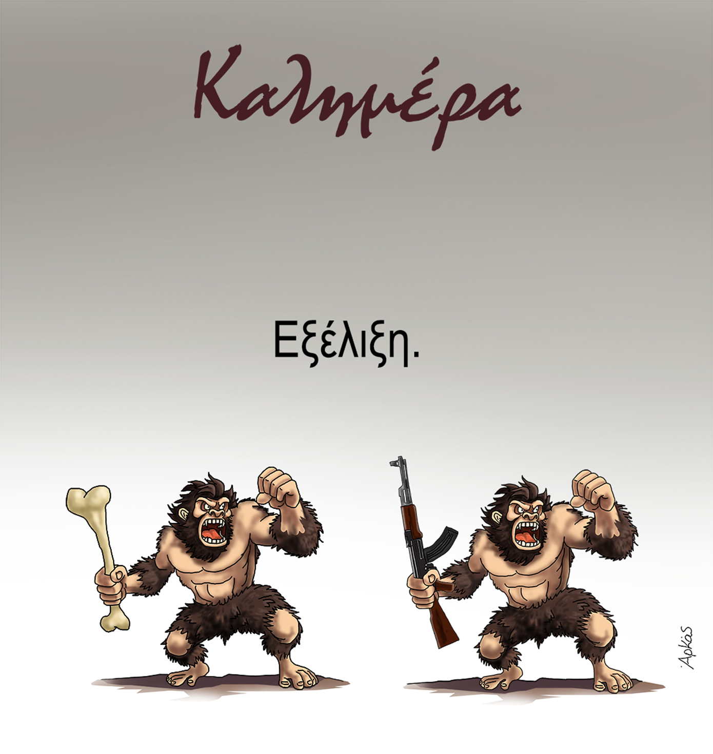 Στο σκίτσο του Αρκά εμφανίζεται ο άνθρωπος των σπηλαίων, πρώτα με ένα ρόπαλο και ύστερα με ένα καλάσνικοφ. «Εξέλιξη» είναι το σχόλιο που συνοδεύει την εικόνα.