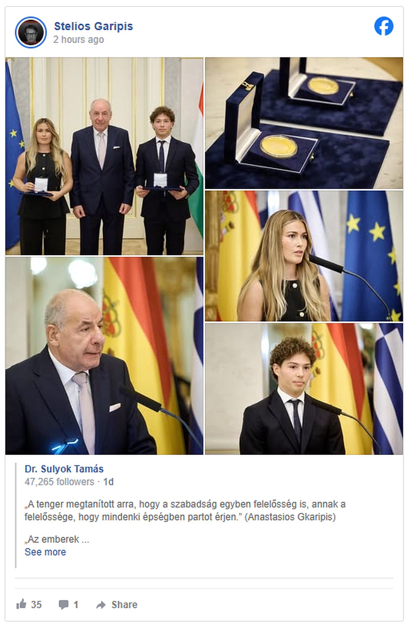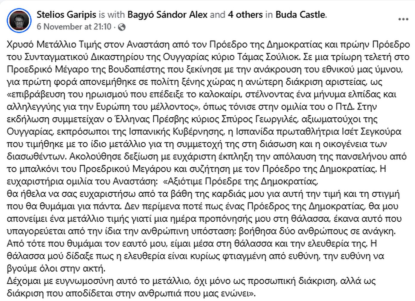 Στην ανάρτησή του αναφέρει χαρακτηριστικά: «Χρυσό Μετάλλιο Τιμής στον Αναστάση από τον Πρόεδρο της Δημοκρατίας και πρώην Πρόεδρο του Συνταγματικού Δικαστηρίου της Ουγγαρίας κύριο Τάμας Σούλιοκ. Σε μια τρίωρη τελετή στο Προεδρικό Μέγαρο της Βουδαπέστης που ξεκίνησε με την ανάκρουση του εθνικού μας ύμνου, για πρώτη φορά απονεμήθηκε σε πολίτη ξένης χώρας η ανώτερη διάκριση αριστείας, ως «επιβράβευση του ηρωισμού που επέδειξε το καλοκαίρι, στέλνοντας ένα μήνυμα ελπίδας και αλληλεγγύης για την Ευρώπη του μέλλοντος», όπως τόνισε στην ομιλία του ο ΠτΔ.