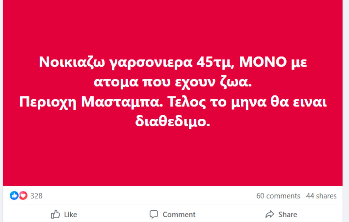 Η γκαρσονιέρα βρίσκεται στην περιοχή του Μασταμπά. Η ιδιοκτήτρια ανέβασε την αγγελία στην ομάδα «ΖΩΦΟΡΟΣ πολιτισμός-περιβάλλον-ζωοφιλία», θέτοντας ως βασικό όρο για τους υποψήφιους ενοικιαστές να έχουν κατοικίδια, ανατρέποντας τους συνήθεις περιορισμούς που συχνά αντιμετωπίζουν οι ιδιοκτήτες ζώων.