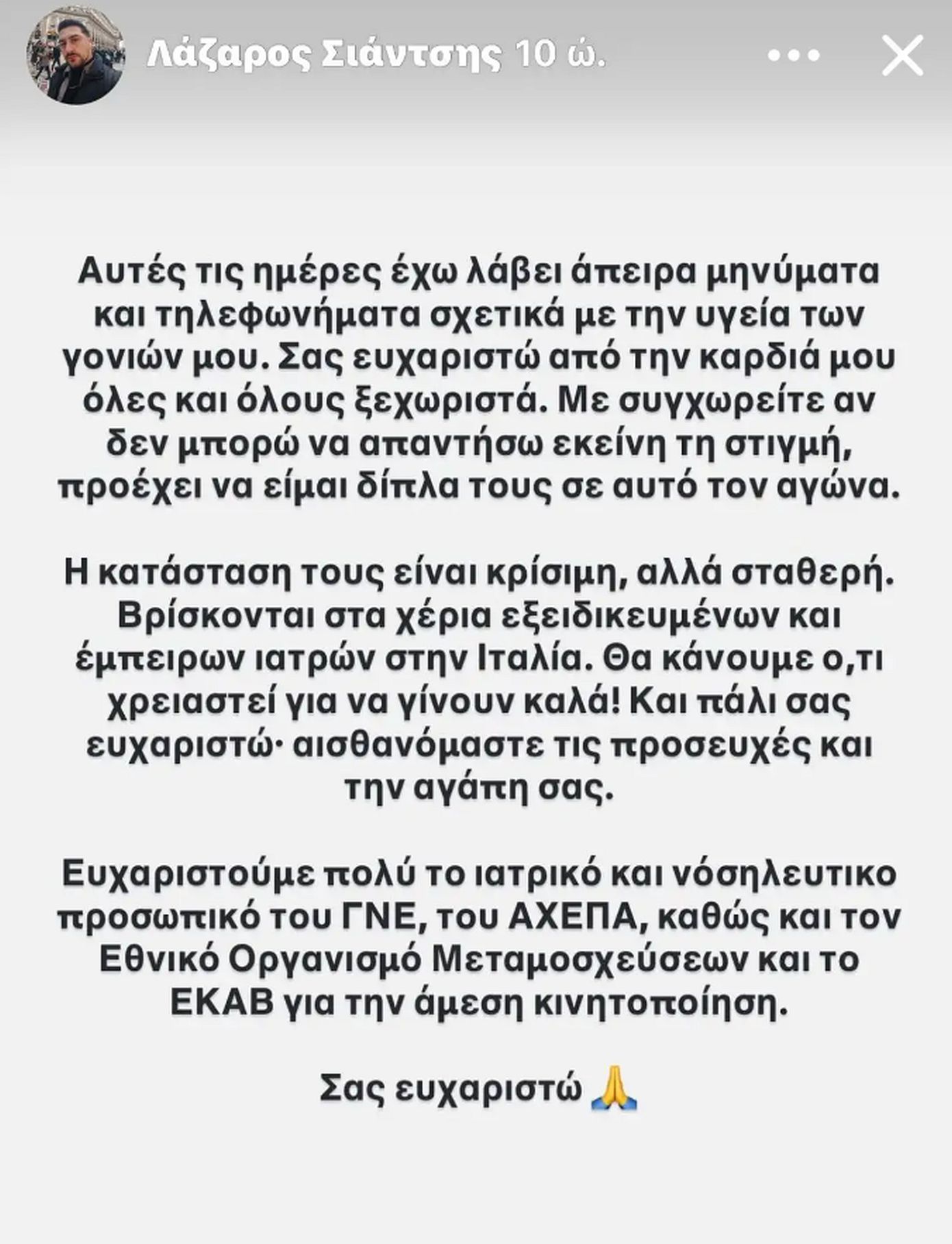 «Αυτές τις ημέρες έχω λάβει άπειρα μηνύματα και τηλεφωνήματα σχετικά με την υγεία των γονιών μου. Σας ευχαριστώ από την καρδιά μου όλες και όλους ξεχωριστά. Με συγχωρείτε αν δεν μπορώ να απαντήσω εκείνη τη στιγμή, προέχει να είμαι δίπλα τους σε αυτό τον αγώνα.