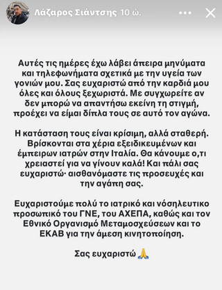 Ο γιος τους, έκανε μία ανάρτηση στα social media στην οποία ευχαριστεί τόσο τους γιατρούς στα νοσοκομεία της χώρας μας, όσο και τον κόσμο που του συμπαραστέκεται σε αυτή τη δύσκολη στιγμή. Ακόμη ενημερώνει ότι η κατάστασή τους είναι κρίσιμη αλλα σταθερή και ότι βρίσκονται στα χέρια εξειδικευμένων και έμπειρων ιατρών στην Ιταλία.