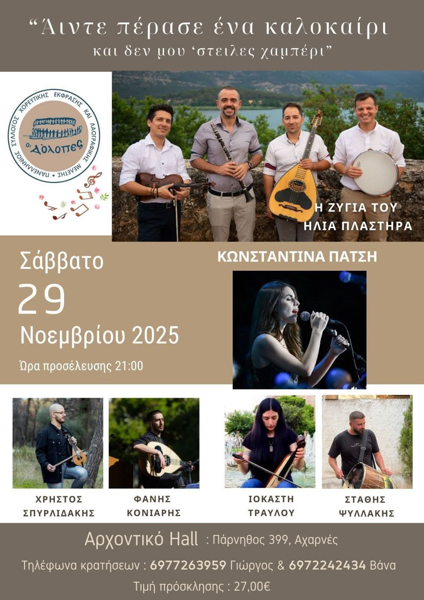 Το γλέντι διοργανώνεται από τον σύλλογο ΟΙ ΔΌΛΟΠΕΣ και θα πραγματοποιηθεί στο Αρχοντικό Hall (Πάρνηθος 399, Αχαρνές) το Σάββατο 29 Νοεμβρίου. Ώρα προσέλευσης: 21:00.