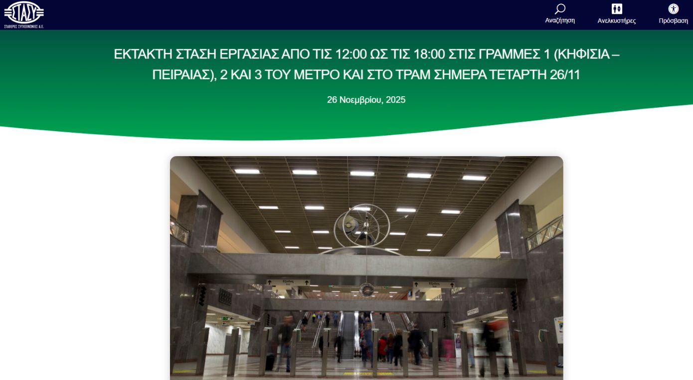 Η ΣΤΑΣΥ ανακοίνωσε πως σήμερα, Τετάρτη, 26/11, πραγματοποιείται έκτακτη στάση εργασίας από τις 12:00 έως τις 18:00 στις γραμμές 1 (Κηφισιά – Πειραιάς), 2 και 3 του Μετρό και στο Τραμ.