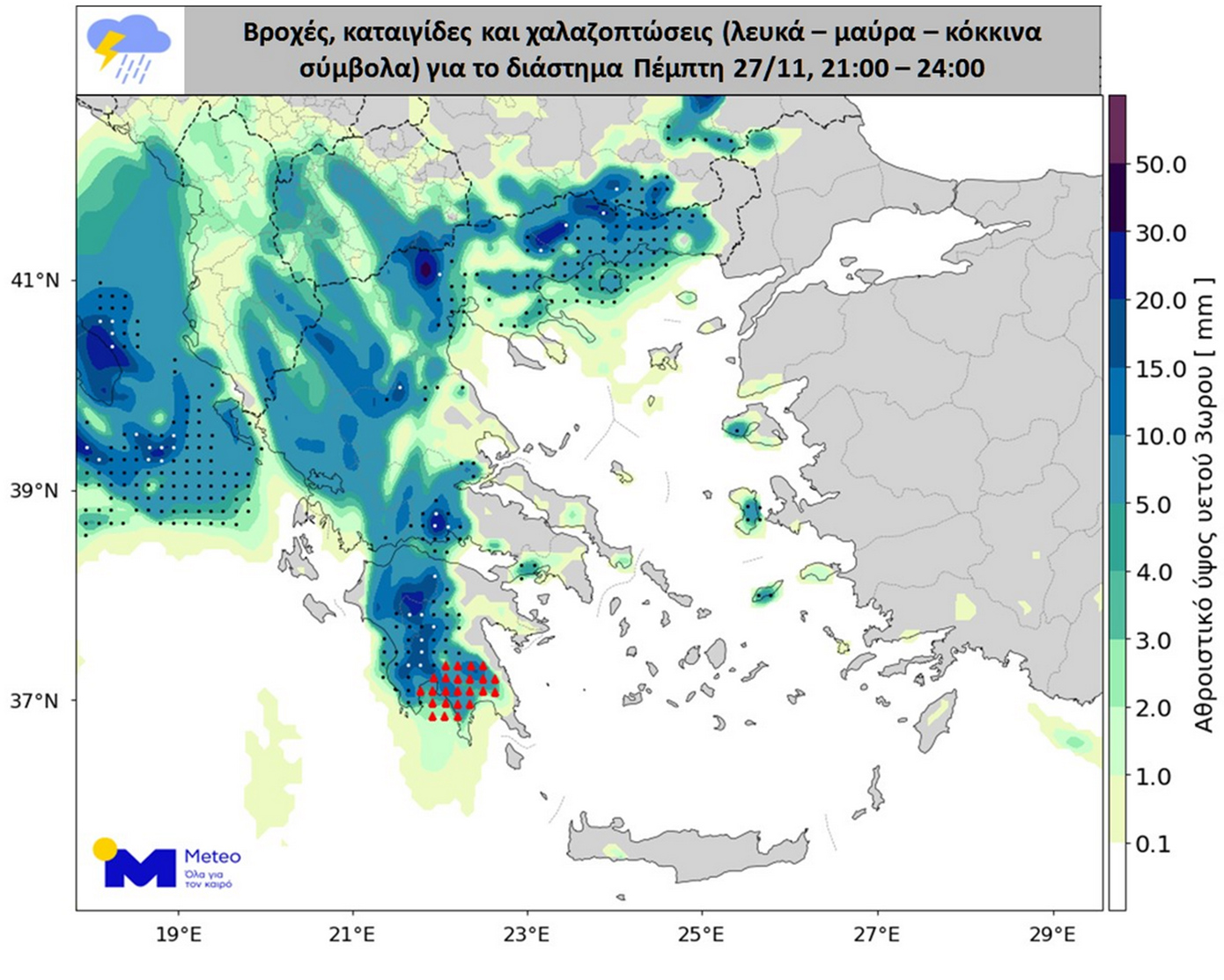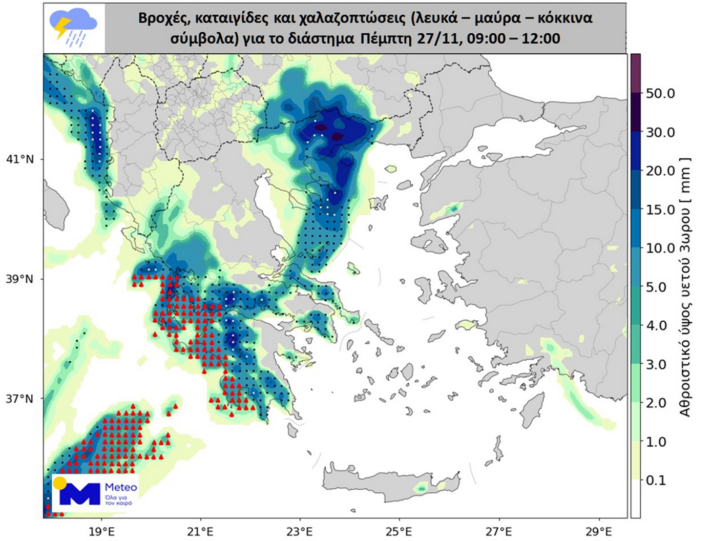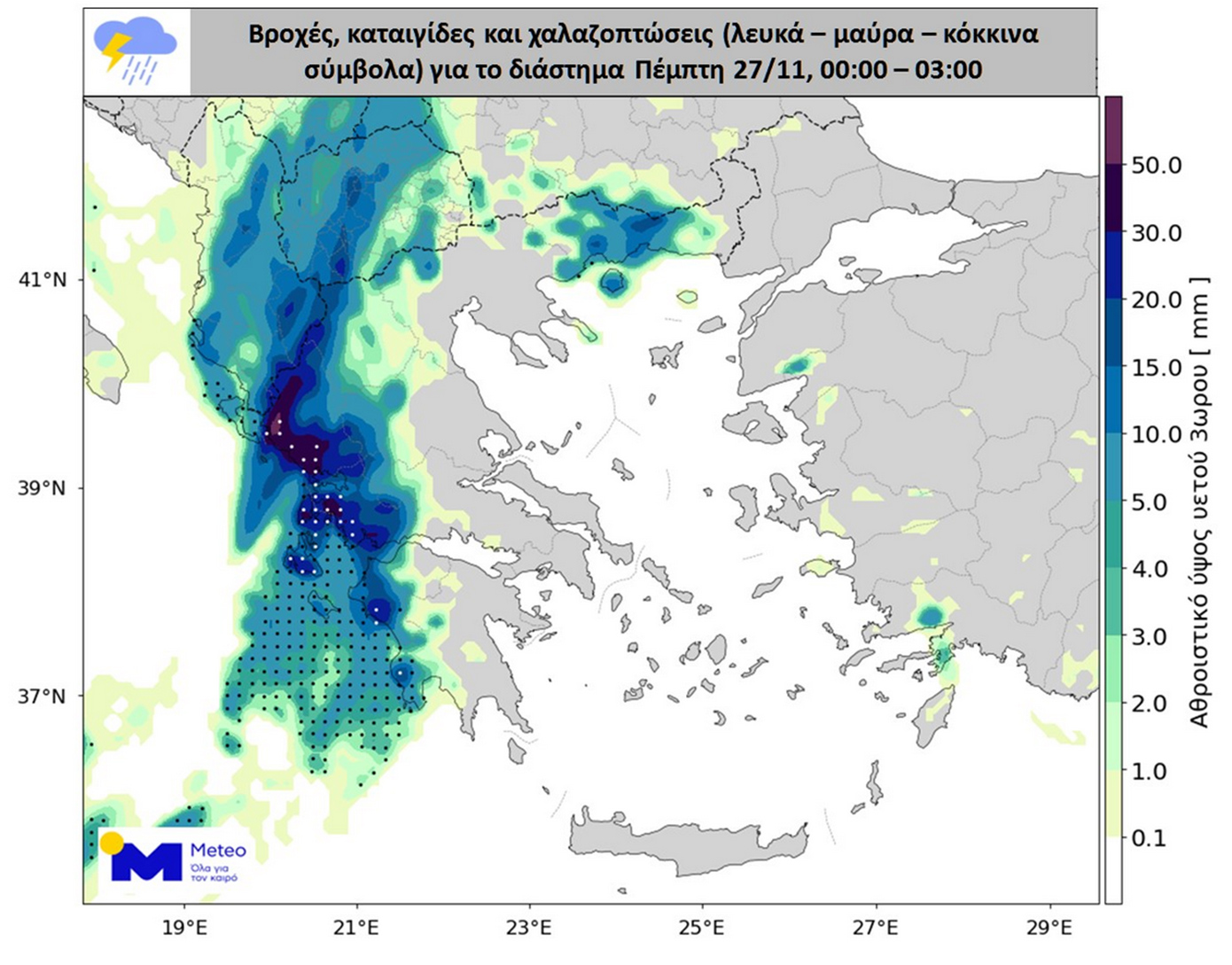 Την Πέμπτη 27/11 έντονες και τοπικά πολύ έντονες βροχοπτώσεις και καταιγίδες θα εκδηλώνονται κατά περιόδους στα Επτάνησα, στα δυτικά ηπειρωτικά, στην Πελοπόννησο, στην Ανατολική Μακεδονία και στη Θράκη, συνοδευόμενα κατά τόπους από χαλαζοπτώσεις. Επισημαίνεται ότι στα Επτάνησα, στα δυτικά ηπειρωτικά και δευτερευόντως στην Πελοπόννησο το χαλάζι ενδέχεται να έχει σχετικά μεγάλο μέγεθος. Στην υπόλοιπη χώρα θα εκδηλωθούν επίσης βροχές και σποραδικές καταιγίδες, με παροδικά έντονα φαινόμενα. Στις περιοχές που θα επηρεαστούν συμπεριλαμβάνονται οι πόλεις της Αθήνας και της Θεσσαλονίκης.