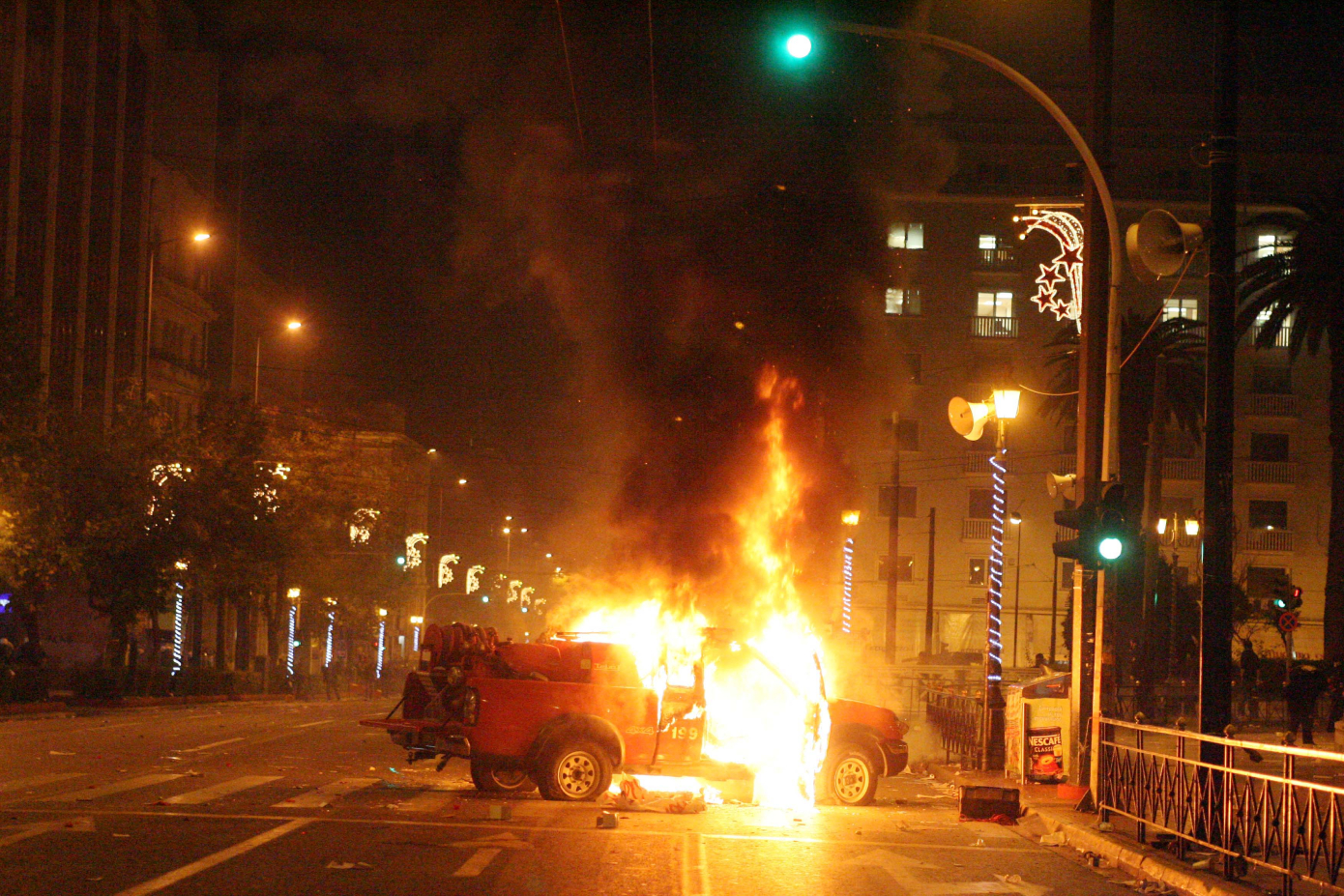 Λίγο πριν από τα Χριστούγεννα, τα πρωτοσέλιδα των διεθνών μέσων φιλοξενούσαν τις εικόνες του φλεγόμενου δέντρου στην πλατεία Συντάγματος.