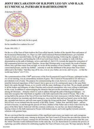 Ο Πατριάρχης Βαρθολομαίος και ο Πάπας Λέων υπενθυμίζουν ότι η αναζήτηση της πλήρους κοινωνίας δεν βασίζεται στην ανθρώπινη διπλωματία, αλλά στην υπακοή στην προσευχή του Κυρίου στο Ευαγγέλιο του Ιωάννη «ἵνα πάντες ἓν ὦσι, καθὼς σύ, πάτερ, ἐν ἐμοὶ κἀγὼ ἐν σοί, ἵνα καὶ αὐτοὶ ἐν ἡμῖν ἓν ὦσιν, ἵνα ὁ κόσμος πιστεύσῃ» («για να είναι όλοι ένα, όπως εσύ, Πατέρα, είσαι σε μένα και εγώ σε σένα, ώστε ο κόσμος να πιστέψει»).