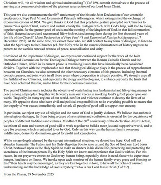 Οι δύο θρησκευτικοί ηγέτες επισημαίνουν, επίσης, ότι φέτος είναι η 60ή επέτειος της Κοινής Δήλωσης του 1965 του Πάπα Παύλου VI και του Οικουμενικού Πατριάρχη Αθηναγόρα, η οποία οδήγησε στην άρση των αφορισμών του 1054. Ευχαριστούν τον Θεό για αυτή την προφητική χειρονομία, η οποία άνοιξε το δρόμο για διάλογο βασισμένο στην «εμπιστοσύνη, την εκτίμηση και την αμοιβαία αγάπη» και ενθαρρύνουν όσους εξακολουθούν να διστάζουν να συμμετάσχουν στο διάλογο, να ακούσουν προσεκτικά το Άγιο Πνεύμα, το οποίο προτρέπει τους χριστιανούς να προσφέρουν στον κόσμο μια ανανεωμένη μαρτυρία συμφιλίωσης.