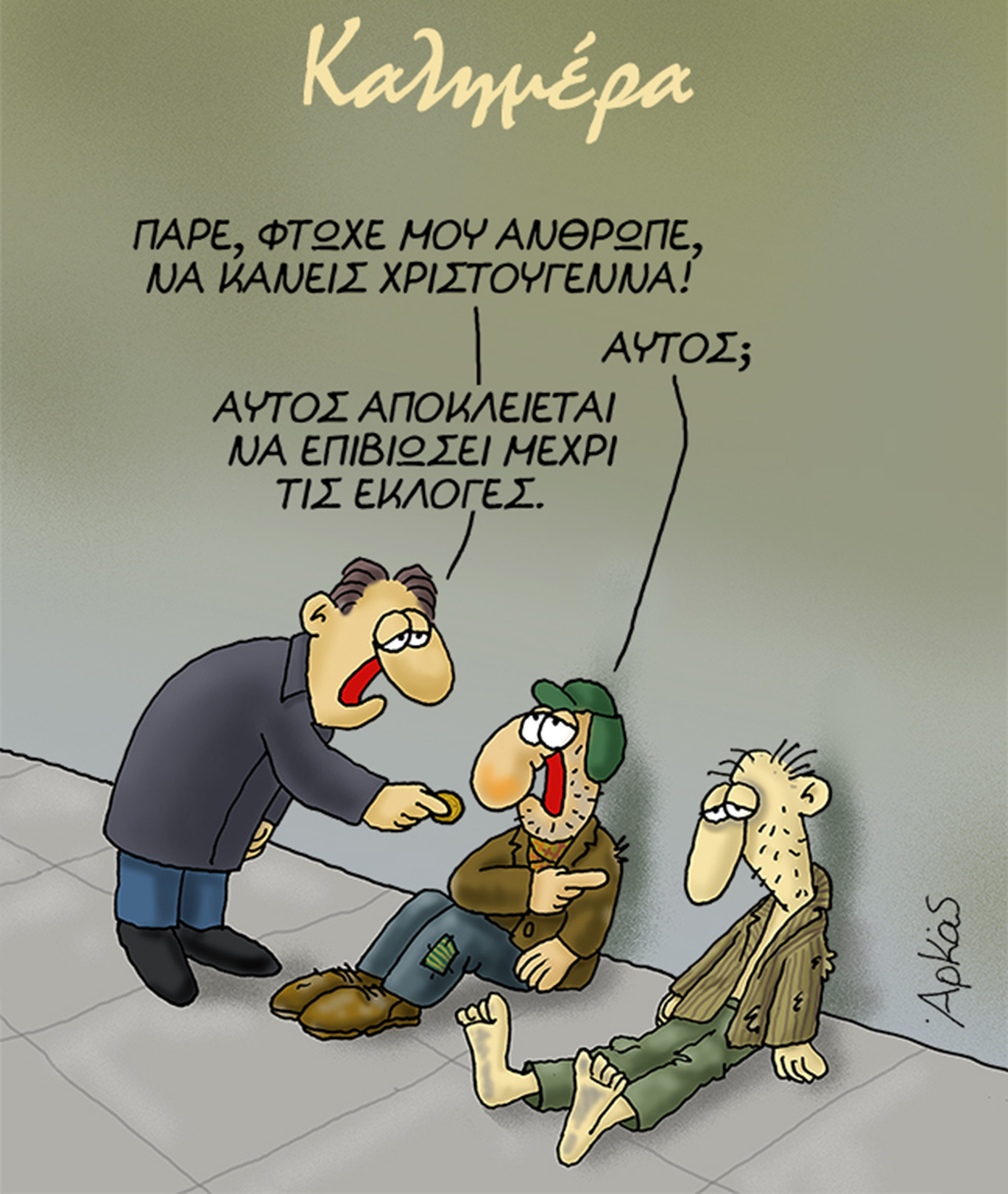 Με τον δικό του αιχμηρό τρόπο σχολιάζει τη φτώχεια, τα Χριστούγεννα που έρχονται και την κοινωνική και πολιτική πραγματικότητα ο Αρκάς, ο οποίος ανάρτησε σήμερα, Τρίτη 2/12 ένα νέο σκίτσο στη σελίδα του στο Facebook για να μας πει «Καλημέρα».