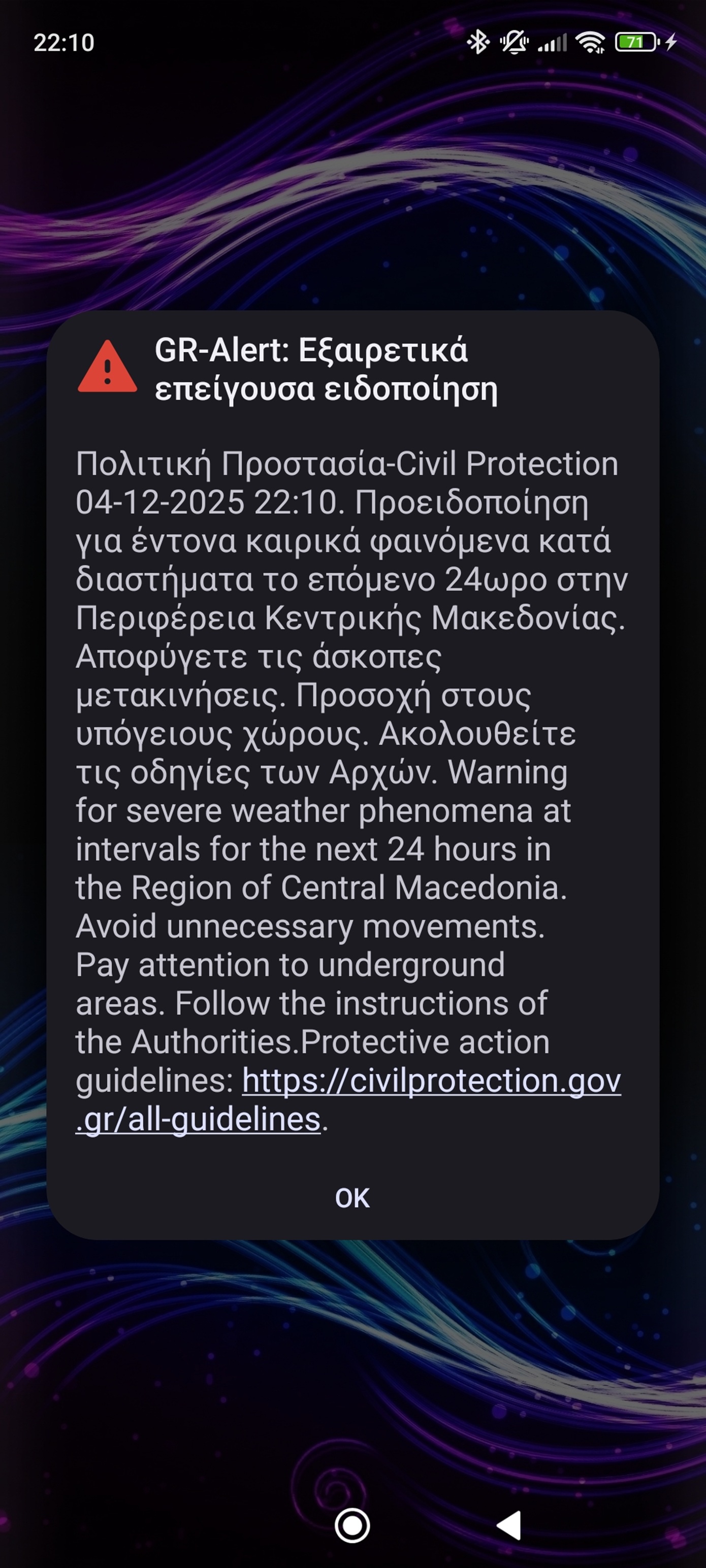 Συγκεκριμένα, έστειλε μήνυμα σε Κεντρική Μακεδόνια Μαγνησία, Λάρισα, Σποράδες, Εύβοια, Χίο, Σάμο, Ικαρία, Δωδεκάνησα, Κρήτη και Κυκλάδες