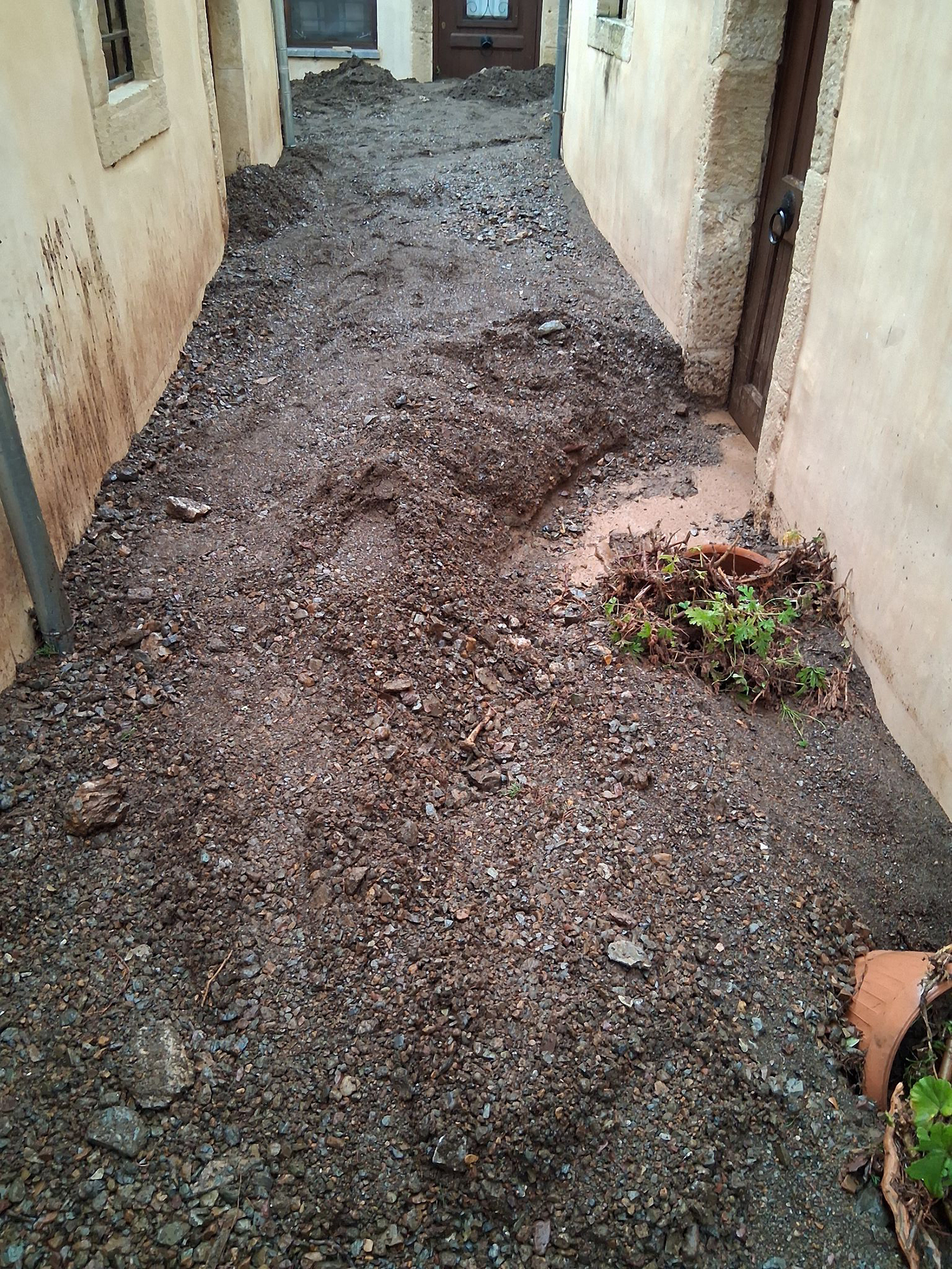Στα Φέρμα Ιεράπετρας, όπου τον περασμένο Ιούλιο η μεγάλη πυρκαγιά μετέτρεψε σε κρανίου τόπο την ευρύτερη περιοχή, η καταρρακτώδης βροχή που έπεσε είχε σαν αποτέλεσμα να μετατραπεί σε ορμητικό χείμαρρο ο δρόμος έξω από το χωριό.