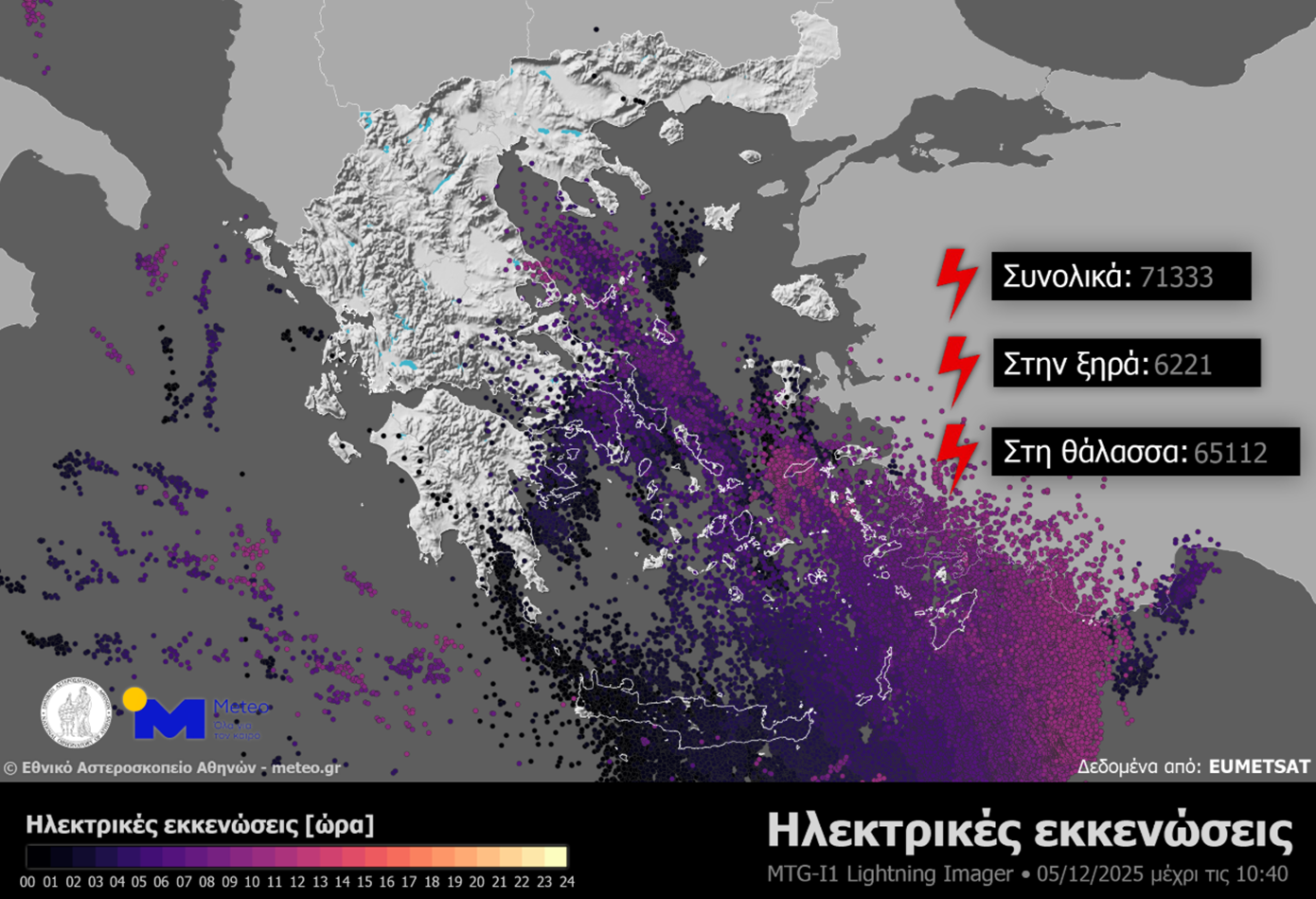 Οι καταιγίδες συνοδεύτηκαν από έντονη ηλεκτρική δραστηριότητα, καθώς σύμφωνα με τα δεδομένα του οργάνου Lightning Imager (LI) του μετεωρολογικού δορυφόρου Meteosat-12, έως τις 10:40 της Παρασκευής 05/12 καταγράφηκαν 6221 ηλεκτρικές εκκενώσεις πάνω από την ξηρά και 65112 πάνω από τη θάλασσα.