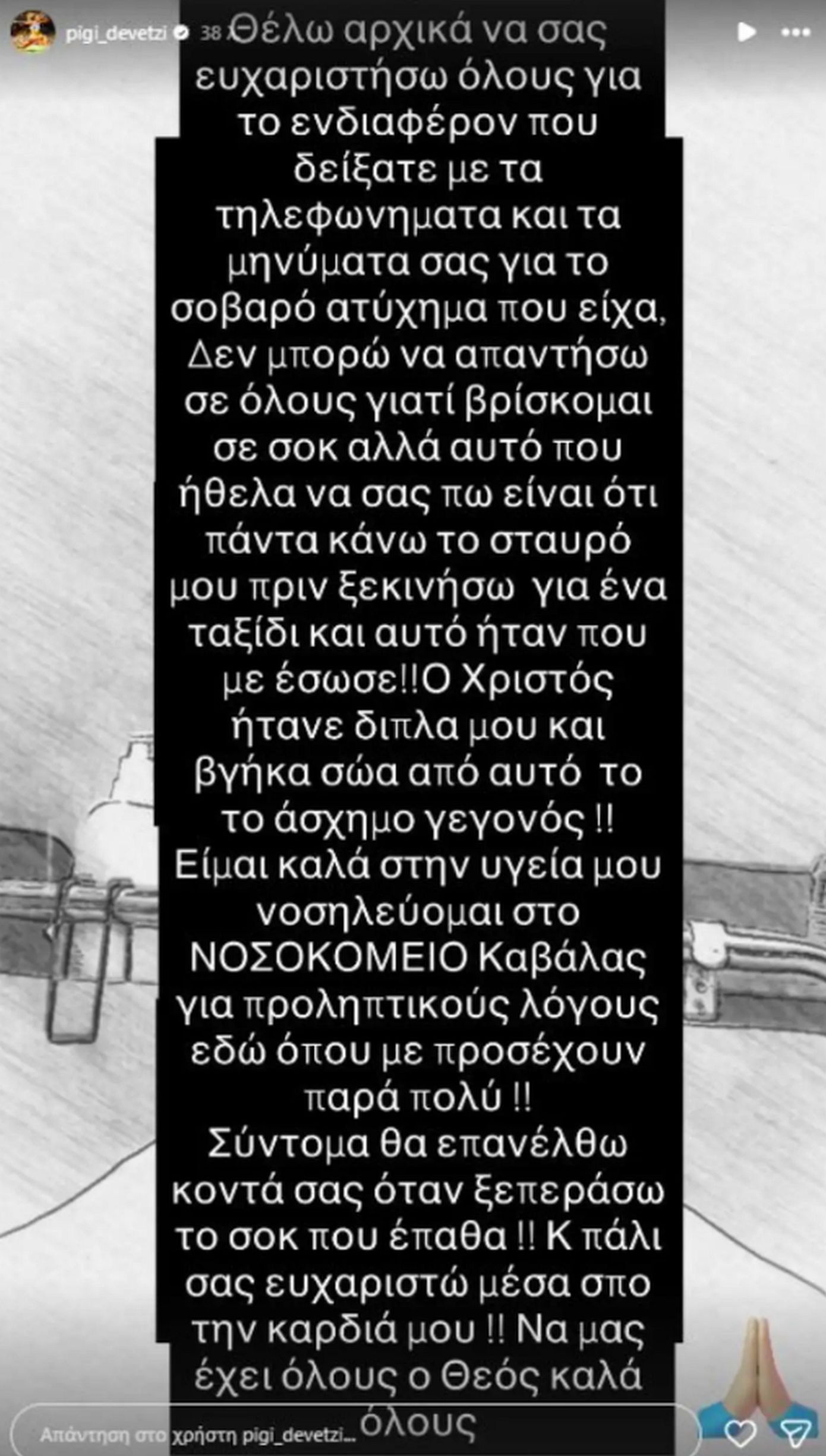 Η Πηγή Δεβετζή, με ένα στόρι της στο Instagram, επικοινώνησε με τους διαδικτυακούς της φίλους, και μίλησε για την κατάσταση της υγείας της ενώ όπως τόνισε προσπαθεί να ξεπεράσει το σοκ, ευχαρίστησε τον κόσμο που έδειξε ενδιαφέρον και τόνισε ότι «Ο Χριστός ήταν δίπλα μου και βγήκα σώα από αυτό το άσχημο γεγονός!!».