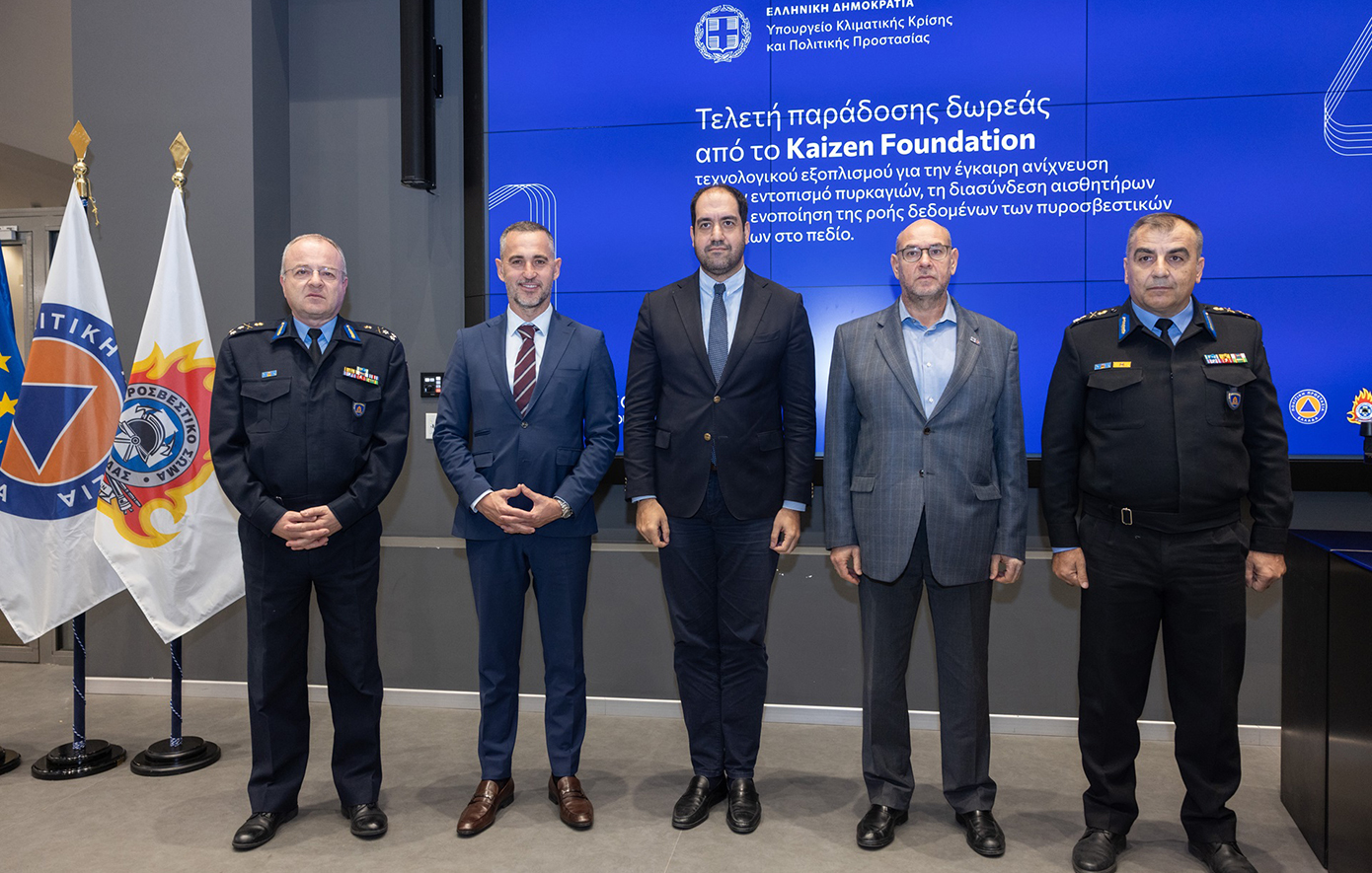 Πραγματοποιήθηκε σήμερα Δευτέρα 8 Δεκεμβρίου 2025, παρουσία του Υπουργού Κλιματικής Κρίσης και Πολιτικής Προστασίας κ. Γιάννη Κεφαλογιάννη η τελετή παράδοσης-παραλαβής προηγμένου τεχνολογικού εξοπλισμού για την επιτήρηση και τον εντοπισμό πυρκαγιών, δωρεά του Kaizen Foundation, στο Υπουργείο Κλιματικής Κρίσης και Πολιτικής Προστασίας.