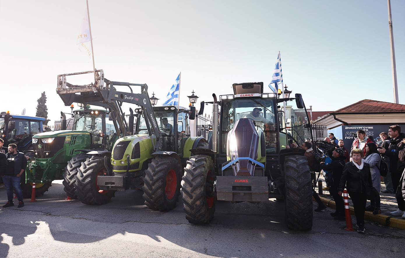 Σε ορισμένα τρακτέρ έξω από το λιμάνι της Θεσσαλονίκης έχουν τοποθετηθεί φέρετρα.
