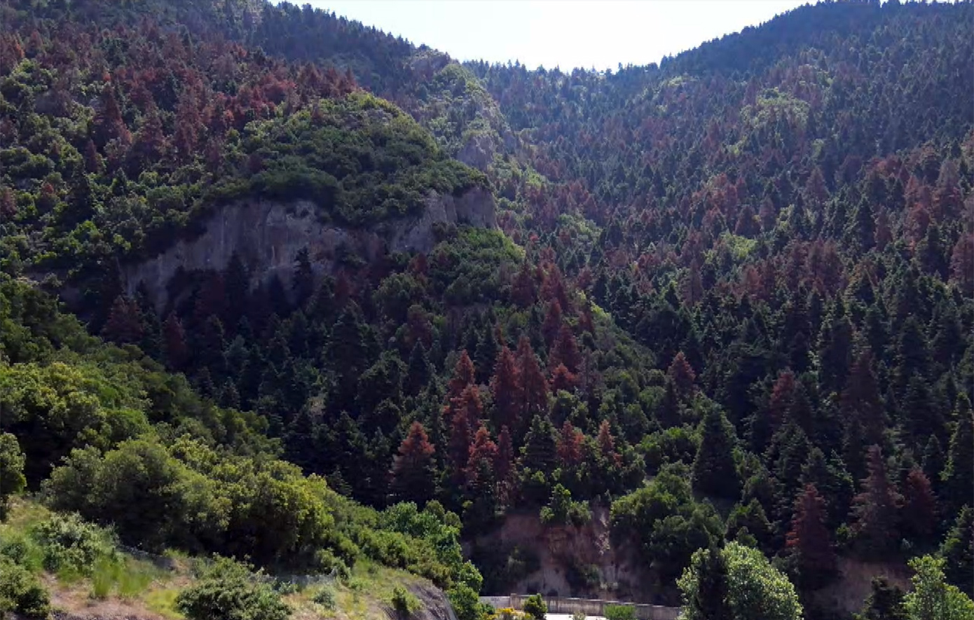 Ακολουθεί η βιολογική επίπτωση. Τα εδάφη που έχουν υποστεί ξηρασία και η συρρίκνωση των υπόγειων υδάτων αφήνουν τα έλατα αδύναμα, δημιουργώντας ευκαιρία για έντομα. «Γνωρίζουμε ότι η σοβαρή ξηρασία αδυνατίζει τα δέντρα», λέει ο Αβτζής. «Αλλά όταν εξετάσαμε πιο προσεκτικά τι συνέβαινε, διαπιστώσαμε ότι τα σκαθάρια φλοιού εκμεταλλεύονταν την κατάσταση και επιτίθονταν στα δέντρα».