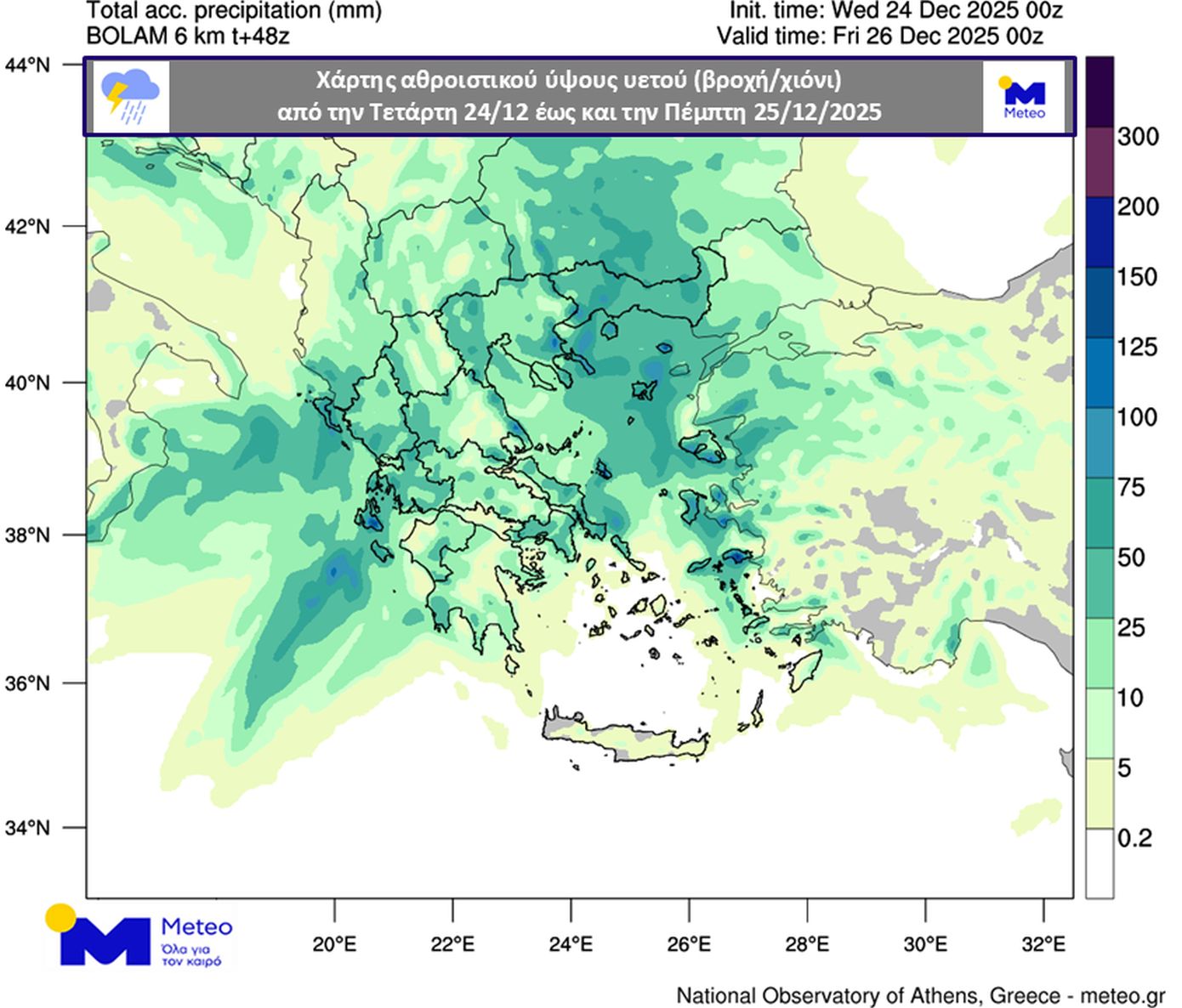 Στον παρακάτω χάρτη, δίνεται το εκτιμώμενο αθροιστικό ύψος υετού (βροχή/χιόνι) από την Τετάρτη 24/12 έως και την Πέμπτη 25/12/2025: