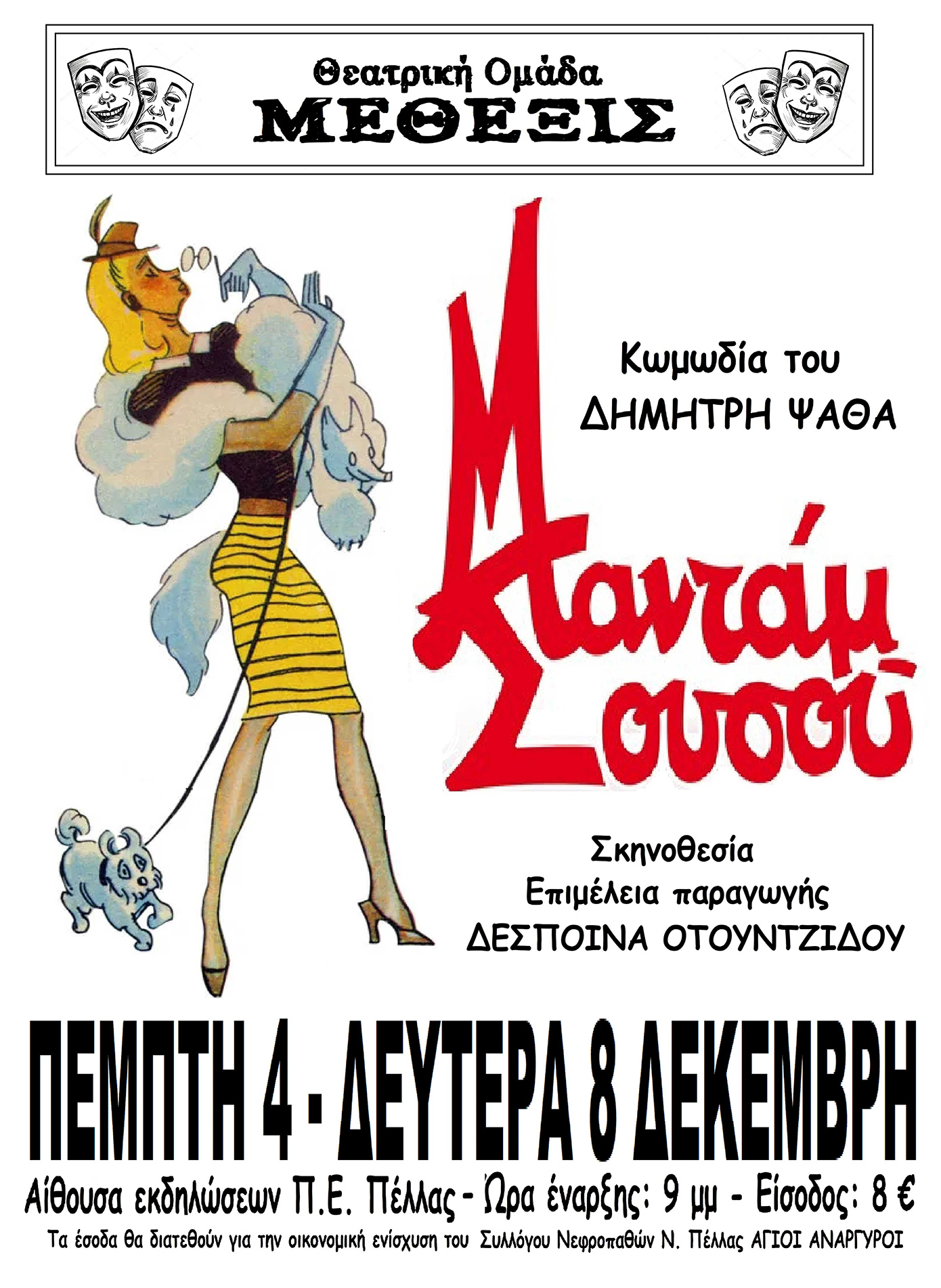 Ξεκινώ από την θρυλική «Μαντάμ Σουσού»που παίχτηκε με τεράστια επιτυχία και προσέλευση κοινού πριν λίγες μέρες στην Έδεσσα από την θεατρική ομάδα «ΜΕΘΕΞΙΣ» για την ενίσχυση του Συλλόγου Νεφροπαθών Πέλλας «ΑΓΙΟΙ ΑΝΑΡΓΥΡΟΙ».