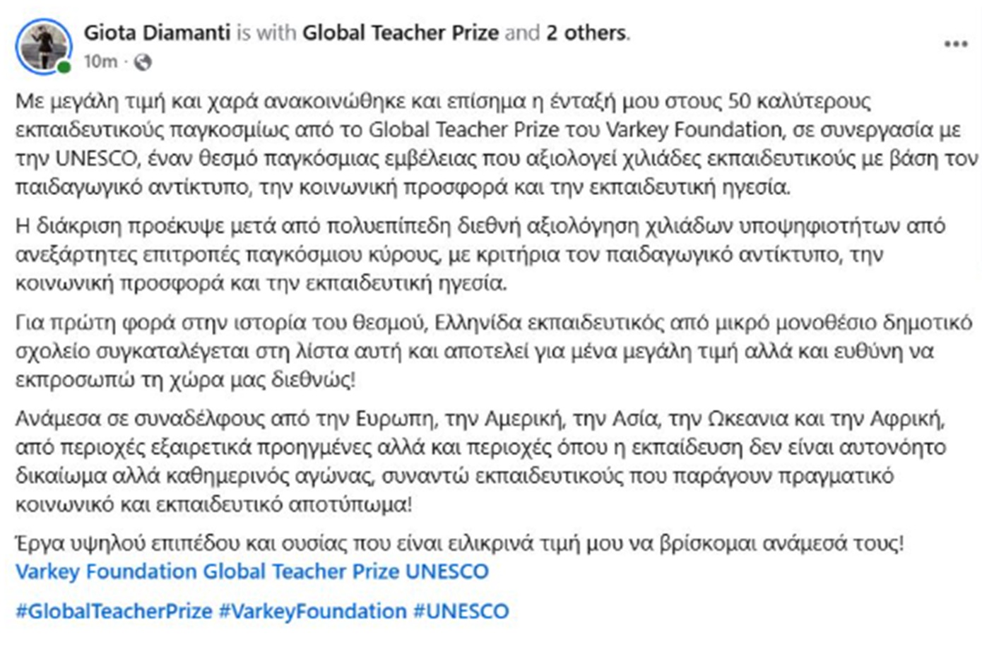 «Με μεγάλη τιμή και χαρά ανακοινώθηκε και επίσημα η ένταξή μου στους 50 καλύτερους εκπαιδευτικούς παγκοσμίως από το Global Teacher Prize του Varkey Foundation, σε συνεργασία με την UNESCO, έναν θεσμό παγκόσμιας εμβέλειας που αξιολογεί χιλιάδες εκπαιδευτικούς με βάση τον παιδαγωγικό αντίκτυπο, την κοινωνική προσφορά και την εκπαιδευτική ηγεσία.