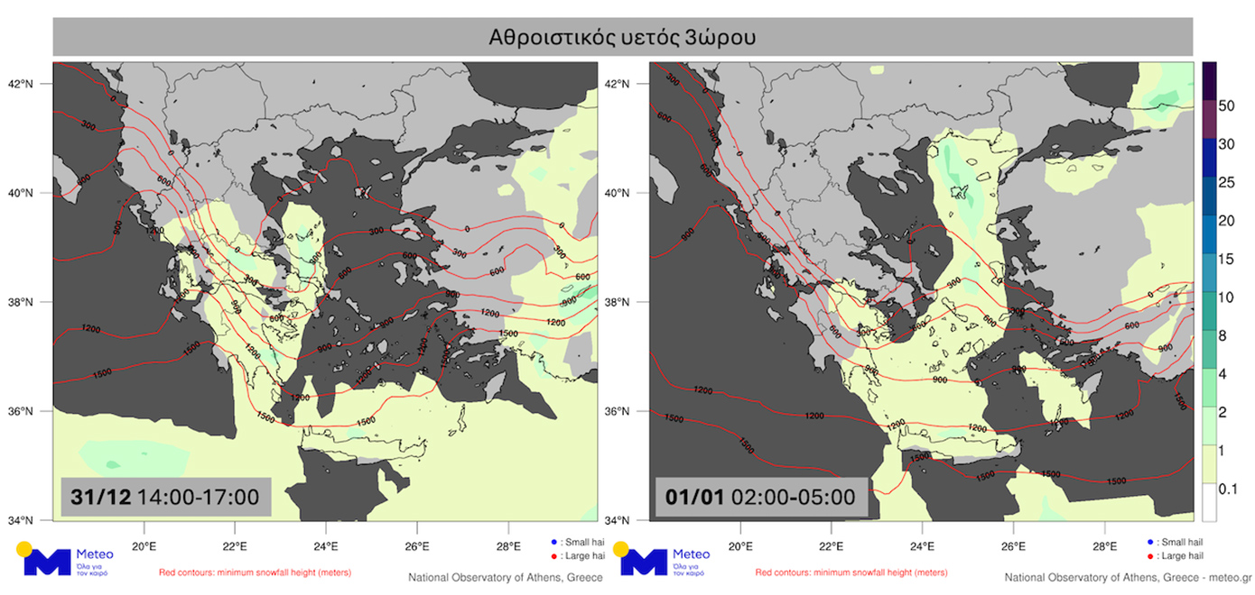 Στην παρακάτω ομάδα χαρτών παρουσιάζεται ο αθροιστικός υετός 3ώρου για τις 14:00-17:00 της Τετάρτης 31/12/2025 και 02:00- 05:00 της Πέμπτης 01/01/2026: