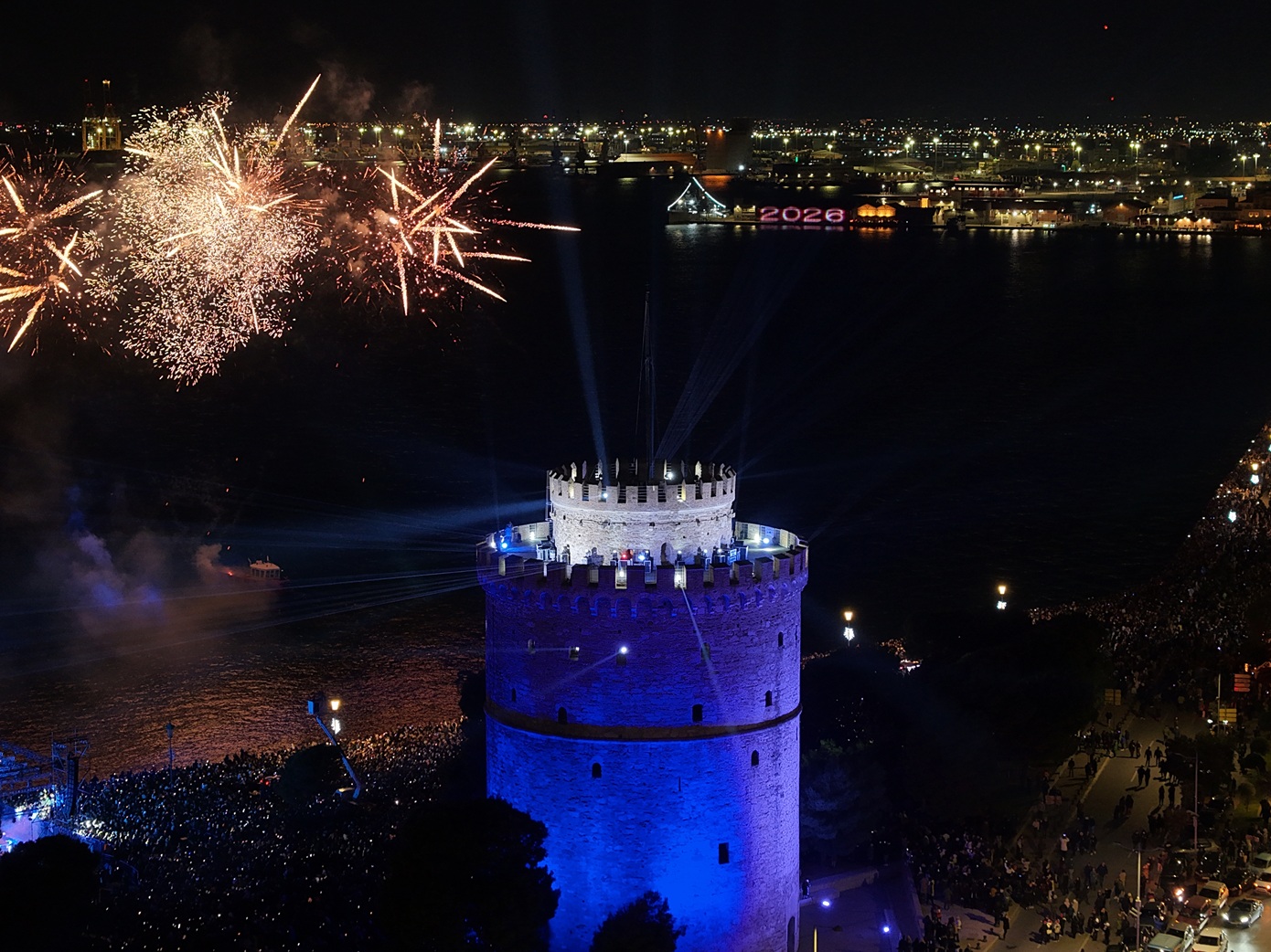 Με ένα εντυπωσιακό laser show, με αμέτρητα πυροτεχνήματα και υπό τους ήχους παγκοσμίου φήμης djs, η Θεσσαλονίκη αποχαιρέτησε το 2025 και υποδέχτηκε το 2026 με φόντο τον εμβληματικό Λευκό Πύργο, που και φέτος αποτέλεσε σημείο συνάντησης για χιλιάδες Θεσσαλονικείς και επισκέπτες.