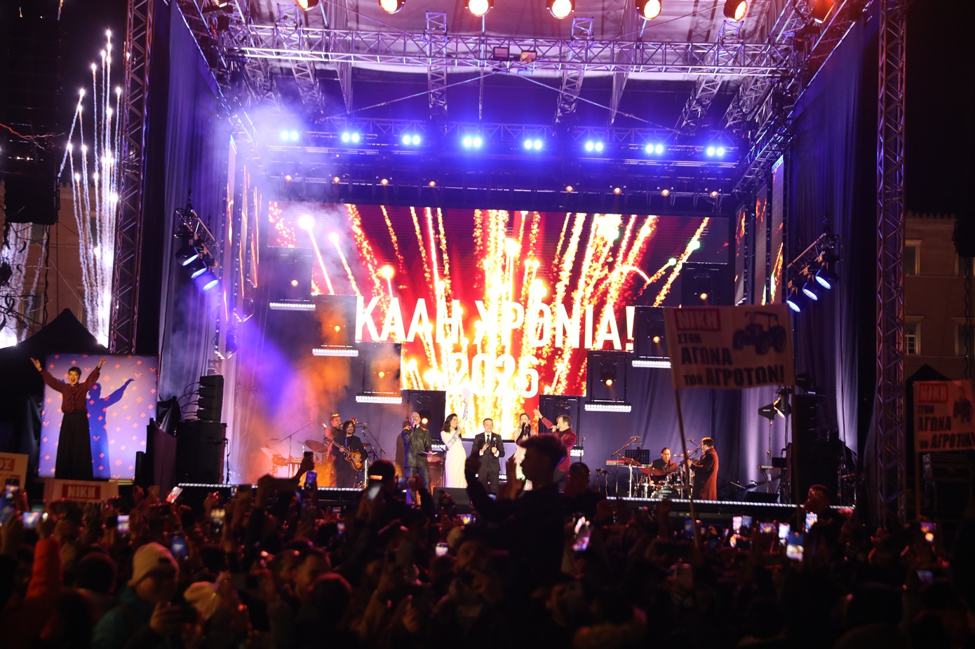 Όπως κάθε χρόνο έτσι και φέτος, η πλατεία Συντάγματος έγινε το επίκεντρο του εορτασμού της Αθήνας για την υποδοχή του νέου έτους. Πλήθος κόσμου αψήφησε το κρύο και μαζεύτηκε από νωρίς για να απολαύσει το μουσικό θέαμα που ετοίμασαν ο Κώστας Μαραβέγιας και η Ρένα Μόρφη.