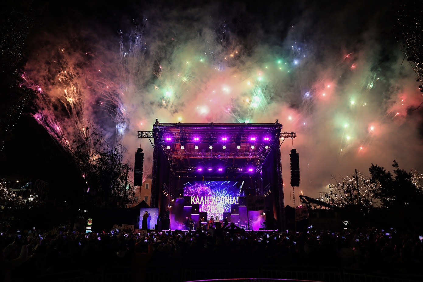 Όταν έφτασε η ώρα για την αλλαγή του χρόνου, ο δήμαρχος Αθηναίων Χάρης Δούκας ανέβηκε στη σκηνή της πλατείας, ευχήθηκε για τη νέα χρονιά, μίλησε για «την Αθήνα που ενώνει» και μαζί με τους καλλιτέχνες έκανε την αντίστροφη μέτρηση για τον ερχομό του 2026.