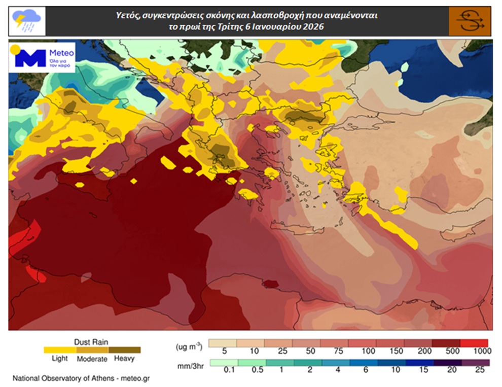 Σύμφωνα με τα τελευταία προγνωστικά στοιχεία του Εθνικού Αστεροσκοπείου Αθηνών λασποβροχές κατά τόπους αναμένονται έως τις πρώτες ώρες της Τετάρτης 07/01, κυρίως στα δυτικά και βόρεια καθώς και στο Βορειοανατολικό Αιγαίο. Στη συνέχεια, οι βροχές με σκόνη θα εντοπιστούν κατά τόπους και σε άλλα τμήματα της χώρας. Από το πρωί της Πέμπτης 08/01, οι λασποβροχές θα περιοριστούν στο Νότιο και Ανατολικό Αιγαίο και στην Κρήτη και αναμένεται να σταματήσουν έως το βράδυ.