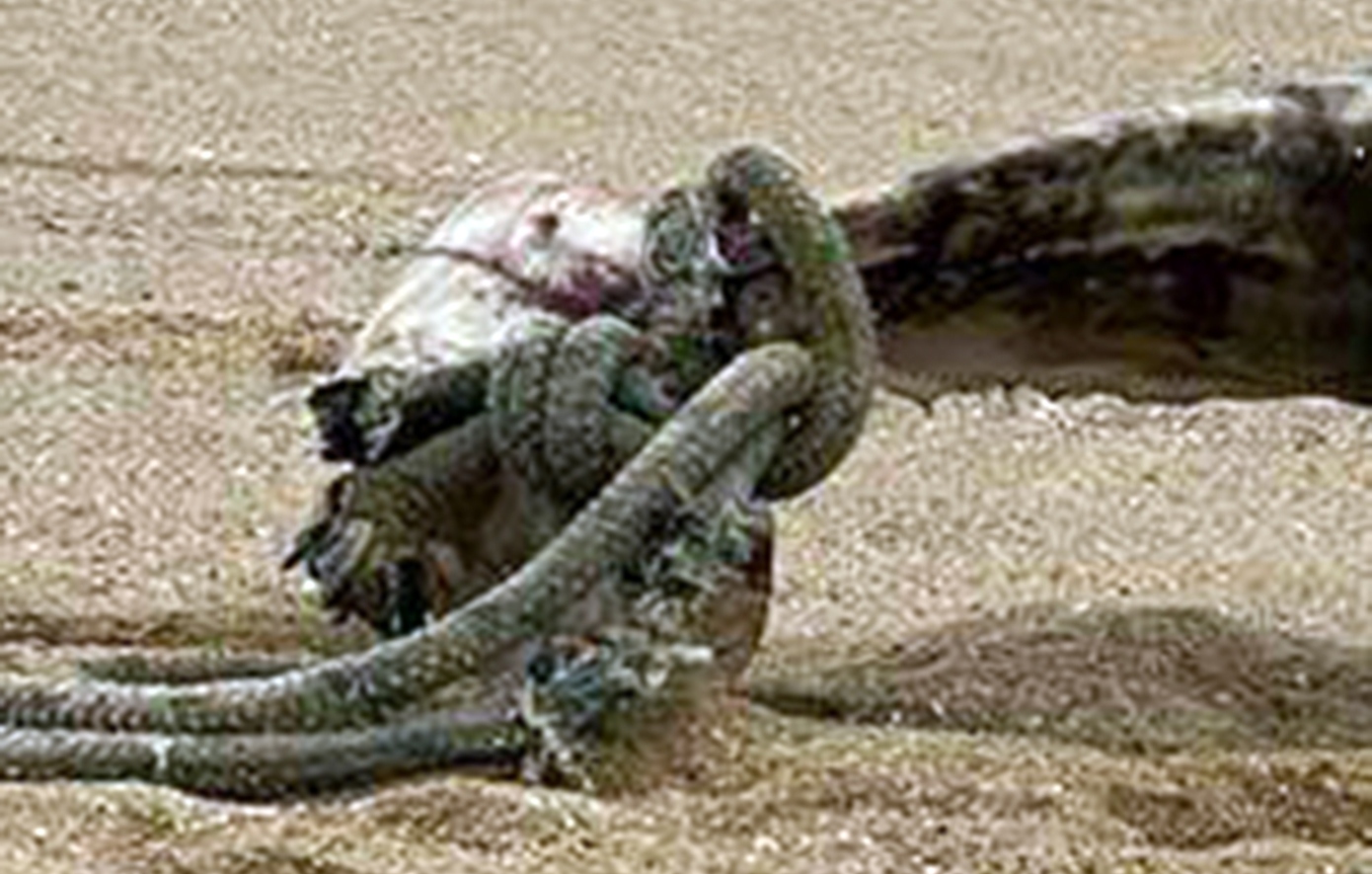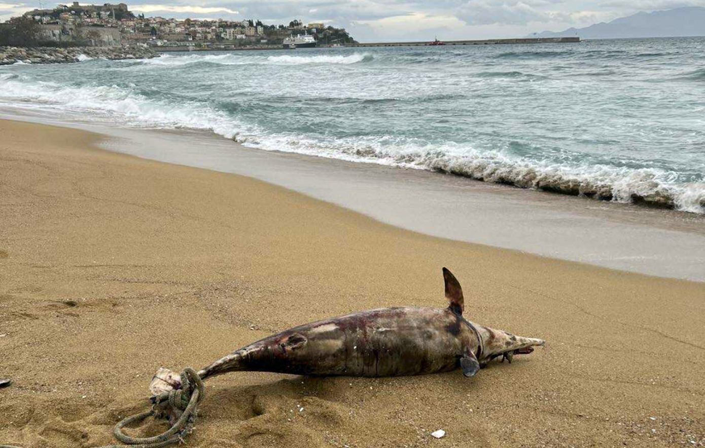 Ένα νεκρό δελφίνι ξεβράστηκε το βράδυ του Σαββάτου (3 Ιανουαρίου 2026) στην παραλία της Ραψάνης στην Καβάλα. Στην ουρά του άτυχου ζώου ήταν δεμένο ένα χοντρό σχοινί.