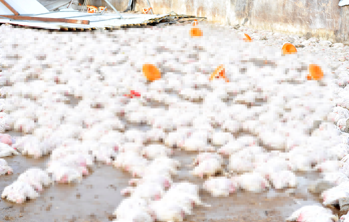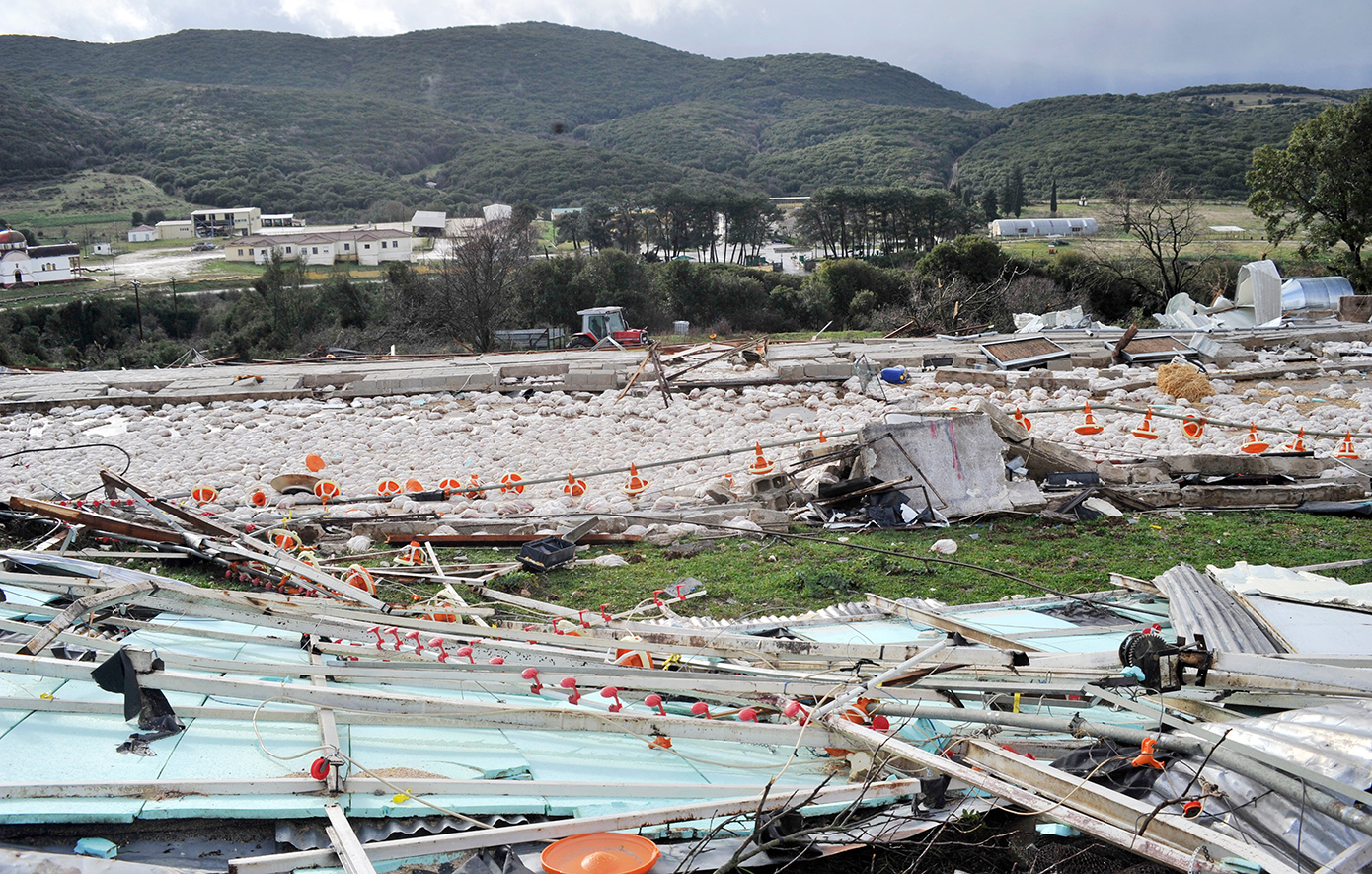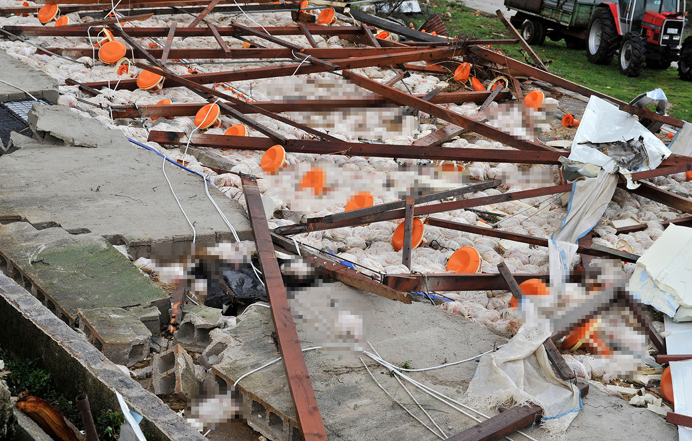 Οι στέγες αποκολλήθηκαν, οι τοίχοι κατέρρευσαν και τα περίπου 30.000 κοτόπουλα που βρίσκονταν στο εσωτερικό καταπλακώθηκαν, όπως φαίνεται και στις σχετικές φωτογραφίες.