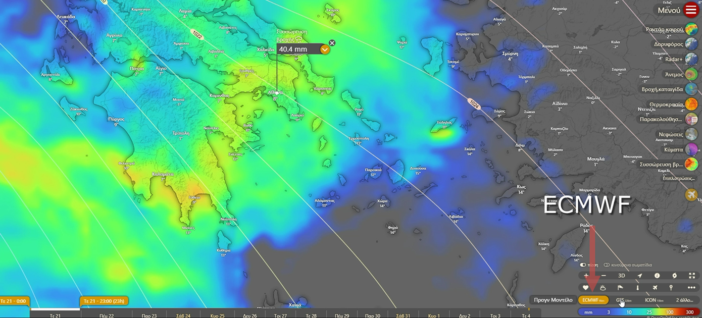 Το Ευρωπαϊκό μοντέλο εμφανίζεται πιο συγκρατημένο στα ύψη βροχής, με τιμές της τάξης των 40–60 mm για την Αττική. Το βασικό του πλεονέκτημα δεν είναι η ένταση, αλλά η χρονική συνοχή, καθώς από τρέξιμο σε τρέξιμο δεν παρουσιάζει απότομες διακυμάνσεις και αποτυπώνει καλύτερα τη διάρκεια του υετού. Η συμπεριφορά αυτή το καθιστά συχνά πιο αξιόπιστο σε επεισόδια παρατεταμένης βροχής χωρίς έντονη καταιγιδογενή δομή.
