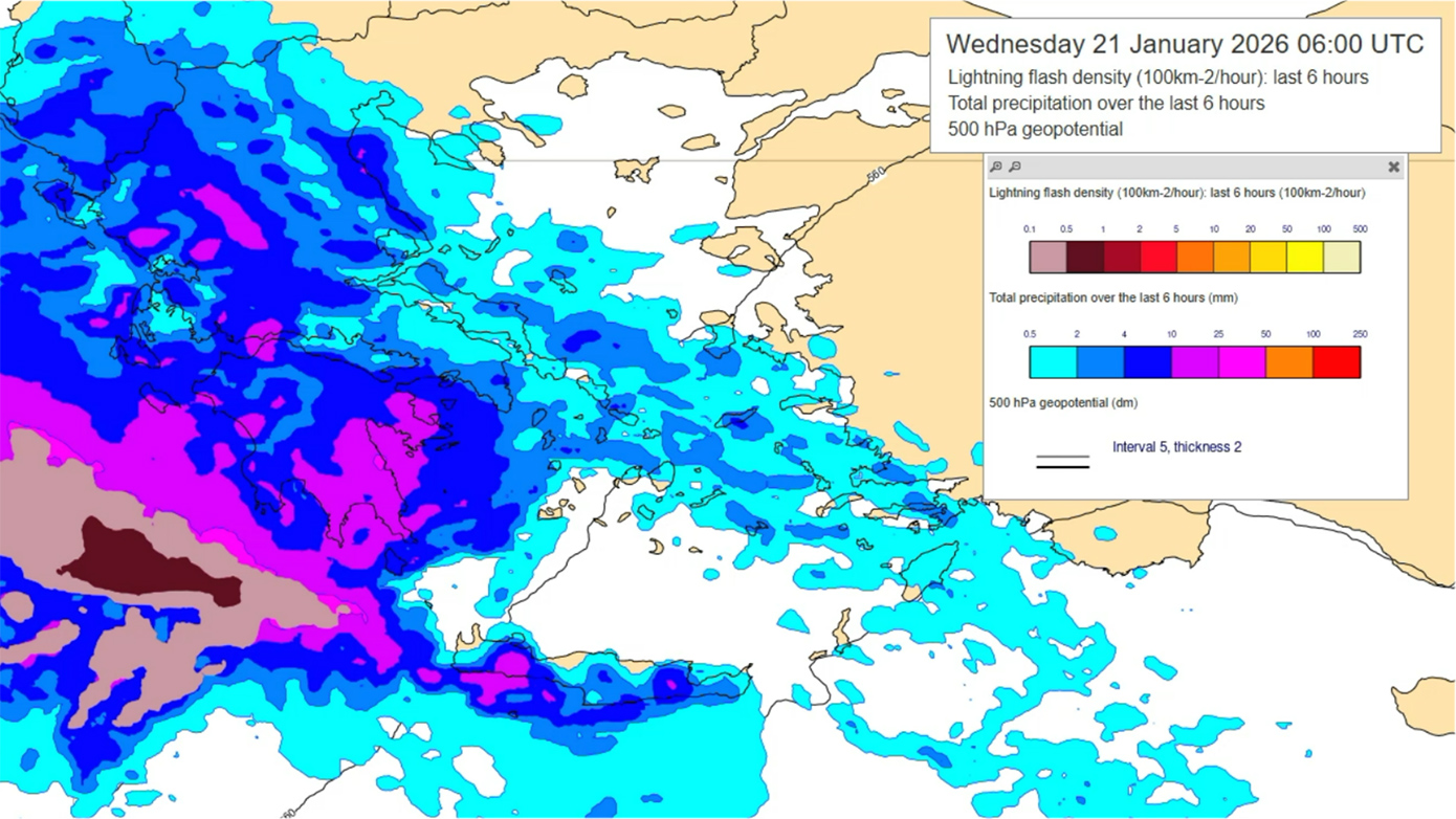 Το σύστημα εμφανίζεται ώριμο, με εκτεταμένες βροχές και εναλλαγές έντασης. Η κεραυνική δραστηριότητα γίνεται πιο αισθητή σε επιλεγμένες περιοχές, χωρίς γενικευμένες καταιγίδες. Στην Αττική, τα φαινόμενα συνεχίζονται με διακυμάνσεις, ενώ η συσσώρευση υετού αρχίζει να παίζει καθοριστικό ρόλο.