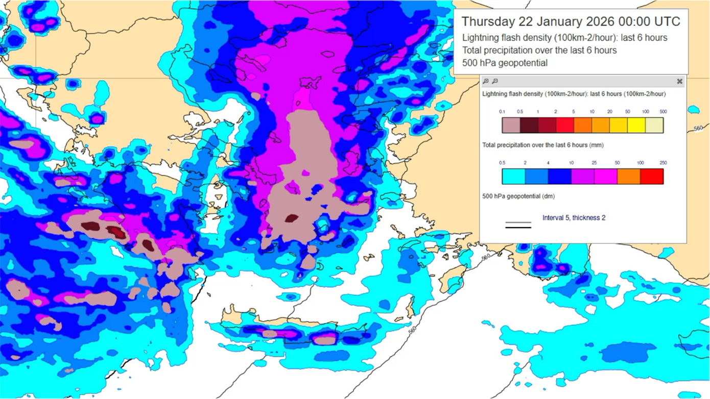 Σύμφωνα με την ανάλυσή του, η κακοκαιρία που επηρεάζει τη χώρα εξετάστηκε με διαχωρισμό του επεισοδίου σε τέσσερα διαδοχικά εξάωρα, μια προσέγγιση που επιτρέπει πιο ρεαλιστική αποτίμηση της χρονικής κατανομής των φαινομένων και αποφεύγει απλουστεύσεις που συχνά οδηγούν σε λανθασμένα συμπεράσματα. Όπως σημειώνει, το ευρωπαϊκό μοντέλο διαφοροποιείται από τα GFS και ICON κυρίως ως προς τα εκτιμώμενα ύψη βροχής, ωστόσο μέχρι στιγμής εμφανίζει πιο αξιόπιστη και σταθερή συμπεριφορά. Τα νεότερα τρεξίματά του συγκλίνουν σε ελαφρώς αυξημένα 24ωρα αθροίσματα υετού σε σχέση με τις πρωινές προγνώσεις, χωρίς να μεταβάλλεται η συνολική εικόνα της κακοκαιρίας.