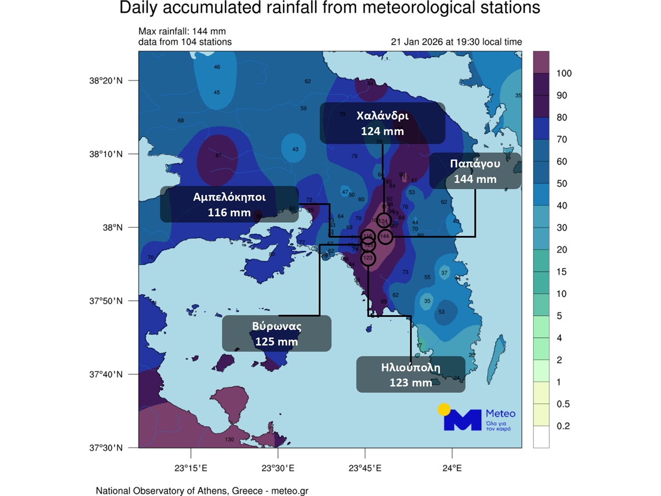 Σε πολλές περιοχές της Αττικής, όπως σε Βύρωνα, Χαλάνδρι, Ηλιούπολη, Αμπελόκηπους τα ύψη βροχής μέχρι χθες στις 19.30 είχαν ξεπεράσει, σύμφωνα με το δίκτυο αυτόματων μετεωρολογικών σταθμών του Εθνικού Αστεροσκοπείου Αθηνών/Meteo.gr τα 115 χιλιοστά βροχής, ενώ στου Παπάγου καταγράφηκαν 146.4 mm βροχής.