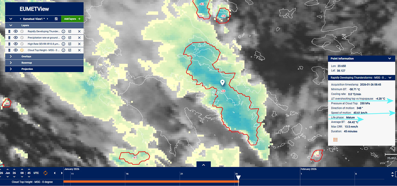 «Η καταιγίδα που καταγράφηκε τις πρωινές ώρες της 26ης Ιανουαρίου, όπως αποτυπώθηκε από τα δορυφορικά προϊόντα nowcasting του EUMETSAT (Rapidly Developing Thunderstorms), παρουσίασε όλα τα χαρακτηριστικά ενός οργανωμένου και ώριμου καταιγιδοφόρου συστήματος, με αυξημένο δυναμικό έντονων φαινομένων», επισημαίνει ο μετεωρολόγος Θεόδωρος Κολυδάς.