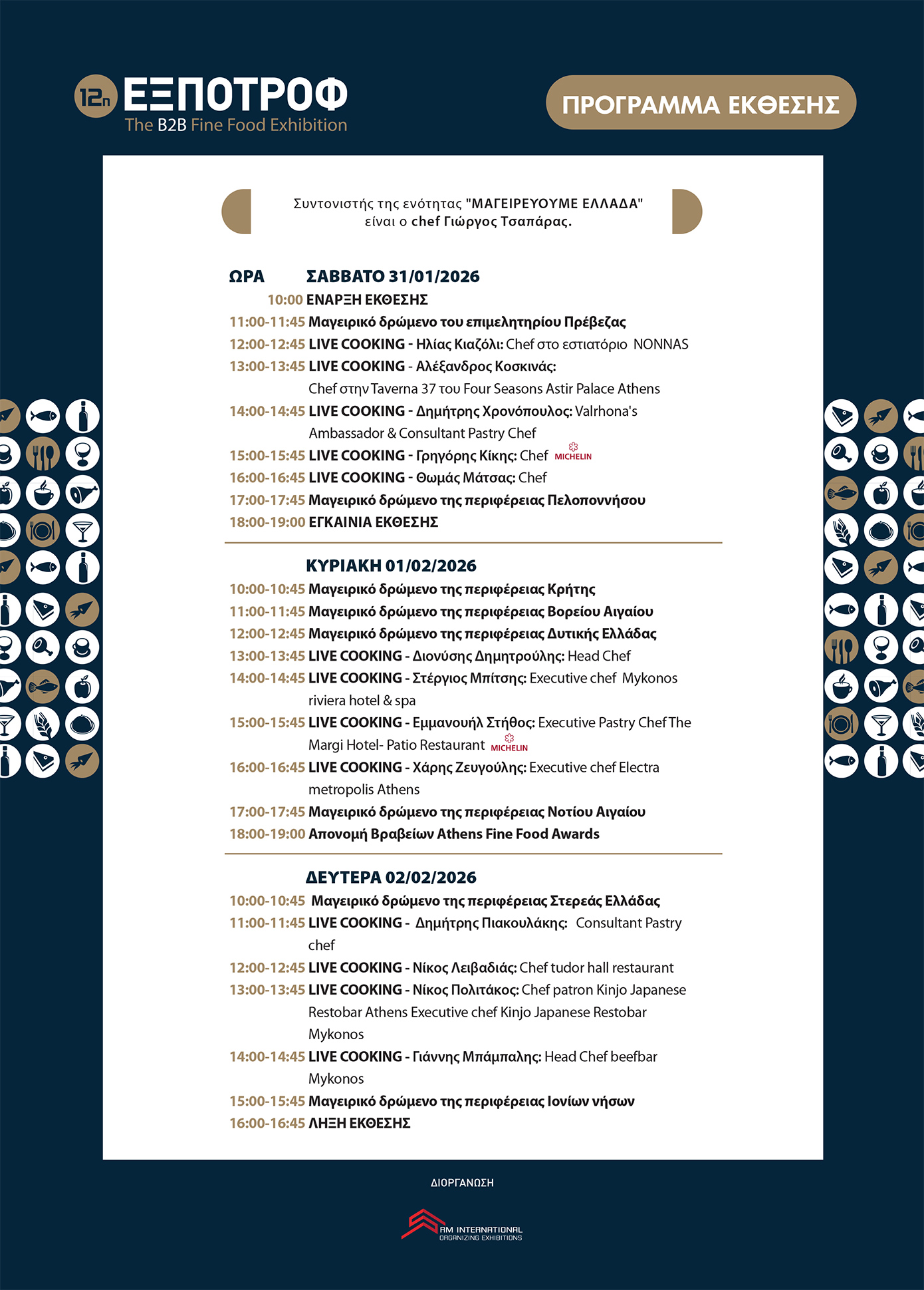 Με το βλέμμα στραμμένο στην ενίσχυση της εξωστρέφειας και τη δημιουργία νέων εμπορικών προοπτικών για τους Έλληνες παραγωγούς, η 12η ΕΞΠΟΤΡΟΦ – The B2B Fine Food Exhibition προετοιμάζεται για τη μεγάλη επιστροφή της. Από τις 31 Ιανουαρίου έως τις 2 Φεβρουαρίου 2026 στο εκθεσιακό κέντρο MEC Παιανίας, ο κλάδος των τροφίμων και ποτών δίνει το ετήσιο ραντεβού του, σε μια διοργάνωση που συνδυάζει την υψηλή ποιότητα με τη στρατηγική δικτύωση.
