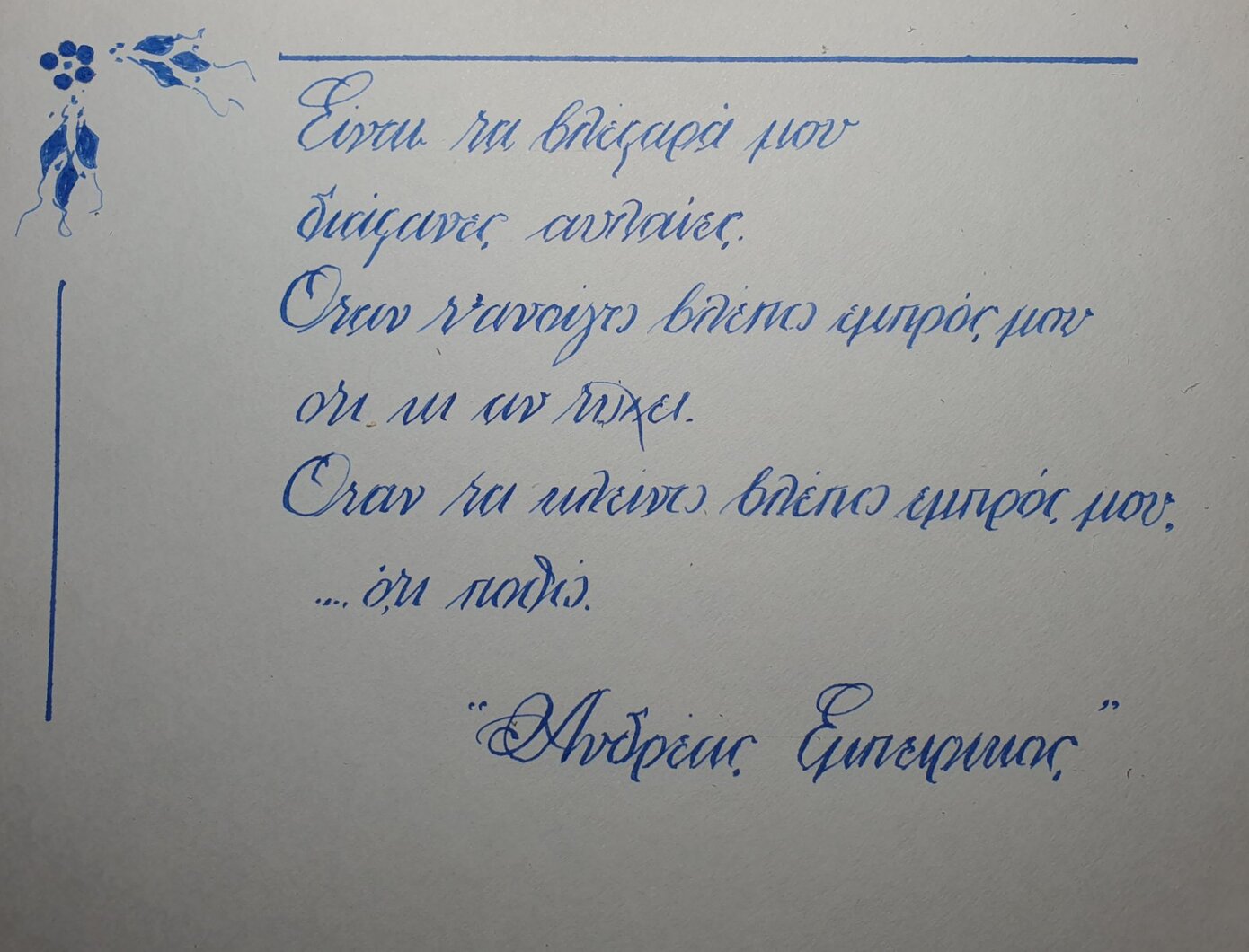 Αρχικά να πω, πως πλέον και δυστυχώς κατ’ εμέ, η καλλιγραφία είναι ένα χόμπυ. Θα σου πω ότι κάποτε δεν υπήρχαν τα κινητά, ούτε καν τα τηλέφωνα και ήθελες να επικοινωνήσεις με έναν άνθρωπο, θα έστελνες γράμμα. Η επιστολή θα έπρεπε να είχε γράμματα ευανάγνωστα για να είναι κατανοητά τα όσα γράφονται.