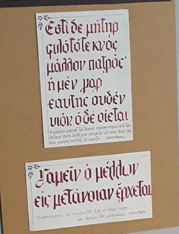 Σήμερα πια όλοι οι άνθρωποι πλέον γράφουν σε κινητά υπολογιστές και διαλέγουν την γραμματοσειρά που θέλουν. Εγώ θυμάμαι το 1957 όταν ήμουν στην πρώτη δημοτικού είχαμε μολύβι, στην Δευτέρα τάξη μας είχαν δώσει το «καλαμάρι» το μπουκάλι με το μελάνι δηλαδή, τον κονδυλοφόρο με την πέννα και καθόμασταν και γράφαμε καλλιγραφία γιατί οι εργασίες μας έπρεπε να ήταν ευανάγνωστες και μάλιστα είχαμε και μάθημα καλλιγραφίας. Τώρα αυτό δεν υπάρχει ούτε καν ως συζήτηση για τα νέα παιδιά. Θεωρώ πάντως πως μαθαίνεις πιο καλά την ελληνική γλώσσα μέσα από την καλλιγραφία γιατί παλεύεις να «ομορφύνεις» γράμματα και λέξεις.