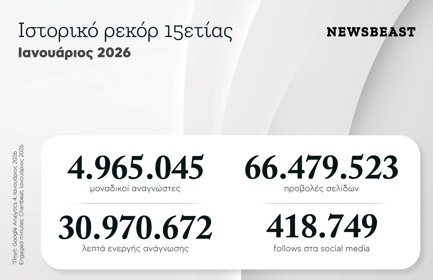 Ο Ιανουάριος του 2026 έκλεισε για το Newsbeast.gr με ένα ιστορικό ορόσημο. Τα μετρήσιμα δεδομένα καταγράφουν ρεκόρ 15ετίας σε αναγνωσιμότητα, σελιδοπροβολές και χρόνο ενεργής ανάγνωσης του site, επιβεβαιώνοντας ότι η ενημέρωση έχει μεγαλύτερη αξία όταν χτίζεται πάνω στην εμπιστοσύνη.
