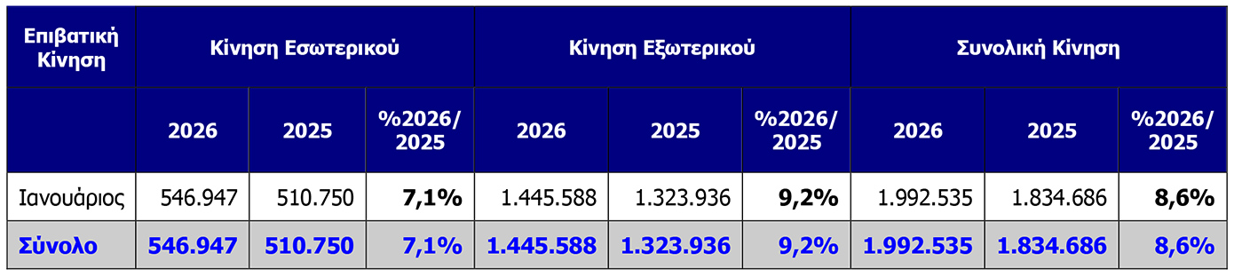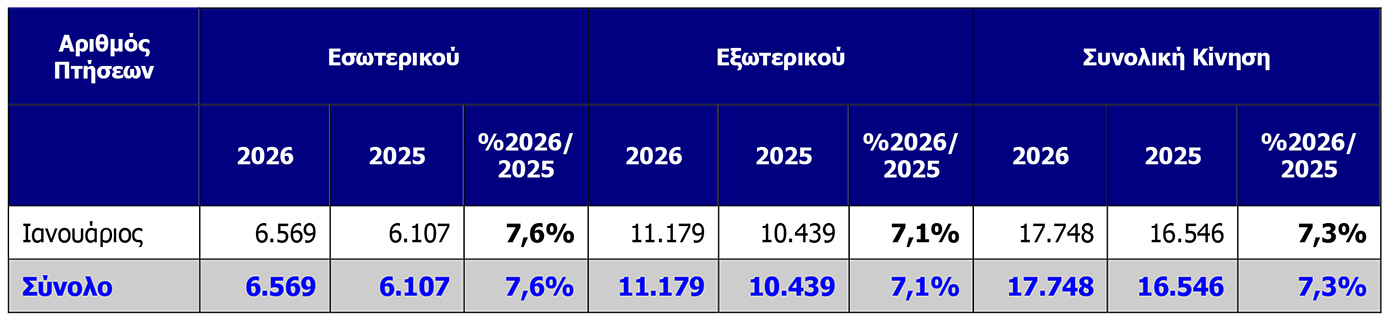 Παράλληλα, ανοδικά κινήθηκαν και οι κινήσεις αεροσκαφών. Ο αριθμός των πτήσεων τον Ιανουάριο του 2026 διαμορφώθηκε σε 17.748, αυξημένος κατά 7,3% σε ετήσια βάση.