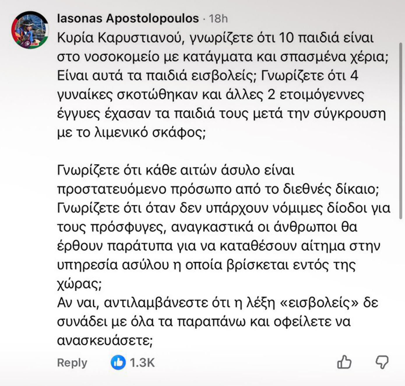 «Κυρία Καρυστιανού, γνωρίζετε ότι 10 παιδιά είναι στο νοσοκομείο με κατάγματα και σπασμένα χέρια; Είναι αυτά τα παιδιά εισβολείς; Γνωρίζετε ότι 4 γυναίκες σκοτώθηκαν και άλλες 2 ετοιμόγεννες έγγυες έχασαν τα παιδιά τους μετά τη σύγκρουση με το λιμενικό σκάφος;