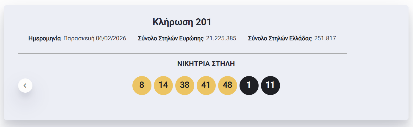 Πραγματοποιήθηκε, σήμερα, Παρασκευή 6 Φεβρουαρίου 2026, η 201η κλήρωση του Eurojackpot.
