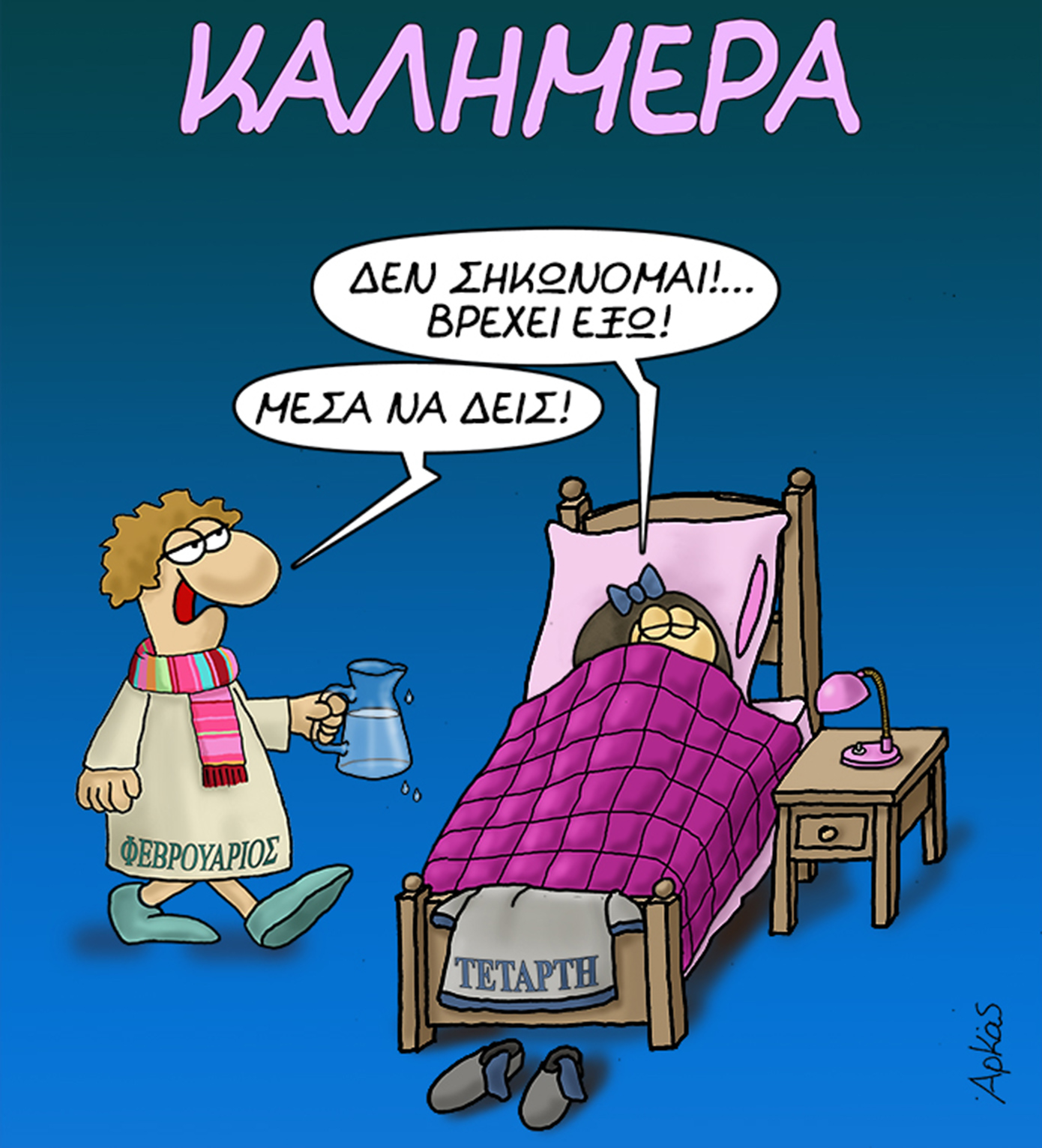 Ειδικότερα, στο σημερινό του σκίτσο, ο Αρκάς σκιτσάρει την Τετάρτη, όπου δηλώνει άρνηση να σηκωθεί από το κρεβάτι, λόγω βροχής.