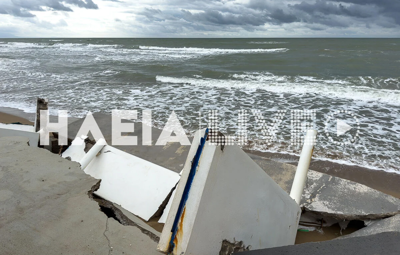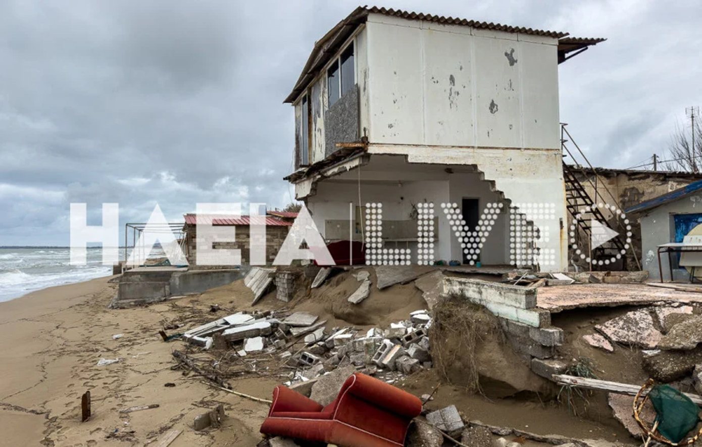 Η θάλασσα «καταβρόχθισε» τη βάση του κτιρίου και σιγά σιγά κατέστρεψε και μεγάλο τμήμα του ισογείου. Σε άλλες περιοχές της Ηλείας, στην Πρέβεζα και στην Παλαιοκαστρίτσα, υπάρχουν αρκετές κυκλοφοριακές ρυθμίσεις.