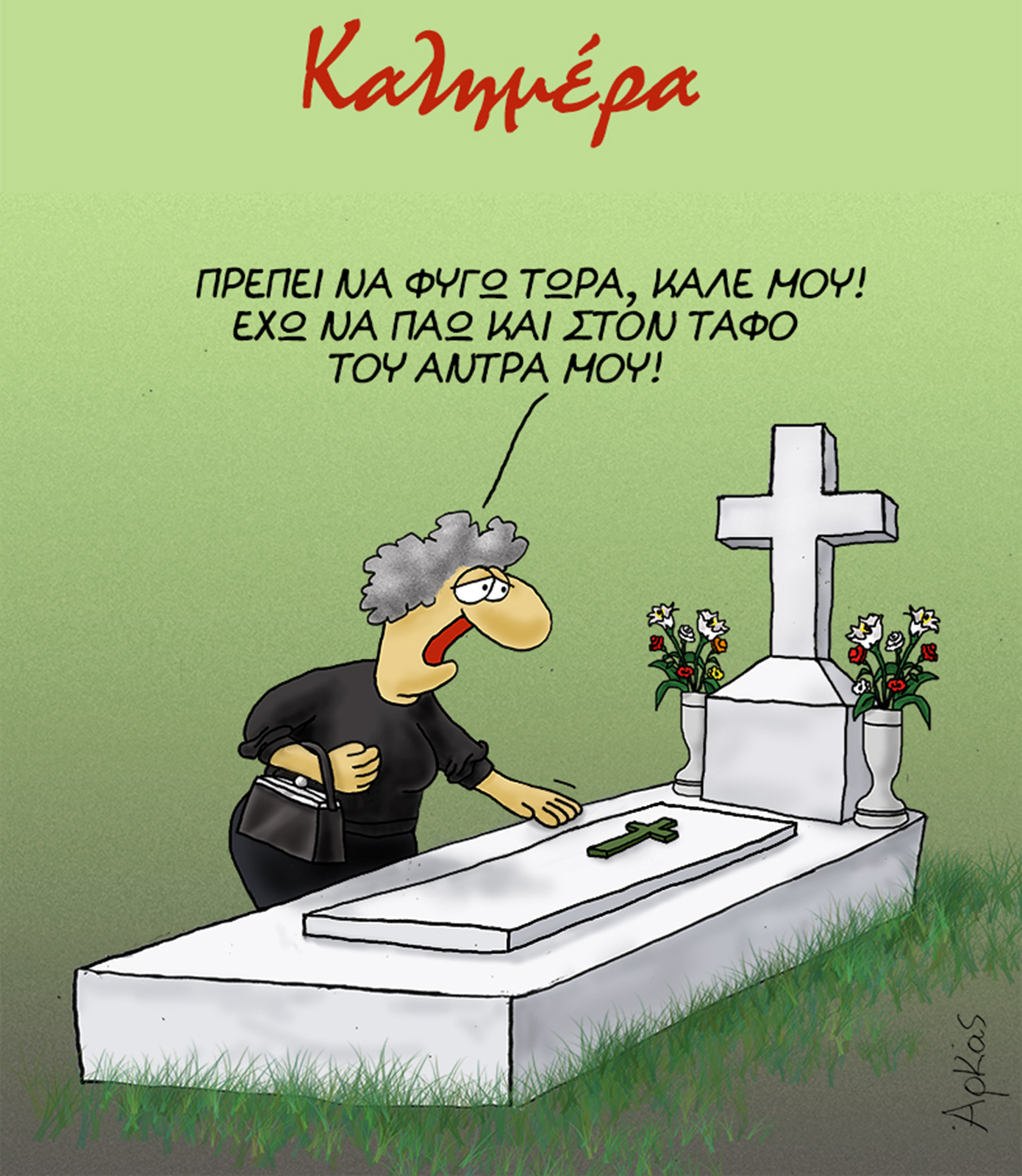 Στο σκίτσο του που δημοσίευσε στην προσωπική του σελίδα στο Facebook παρουσιάζει μια γυναίκα ντυμένη στα μαύρα να έχει επισκεφθεί το νεκροταφείο.