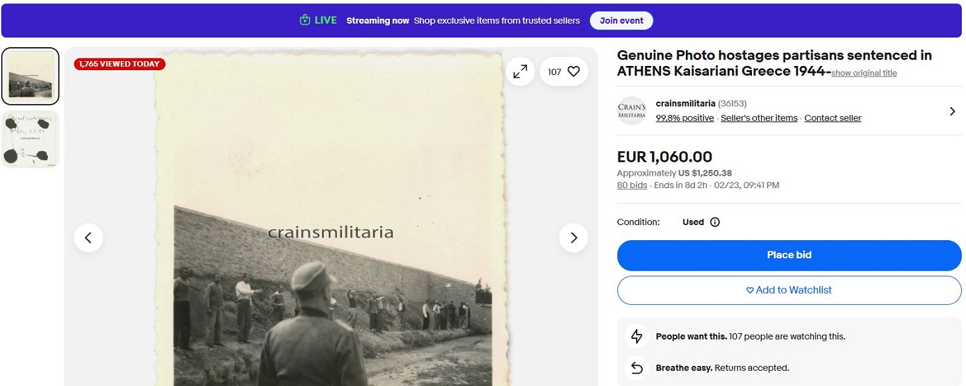Από μερικές δεκάδες έως και χιλιάδες ευρώ αγγίζει η τιμή των φωτογραφιών που πωλούνται στο eBay και δείχνουν την εκτέλεση των 200 στο Σκοπευτήριο της Καισαριανής από τους Ναζί κατά τη διάρκεια της Κατοχής.