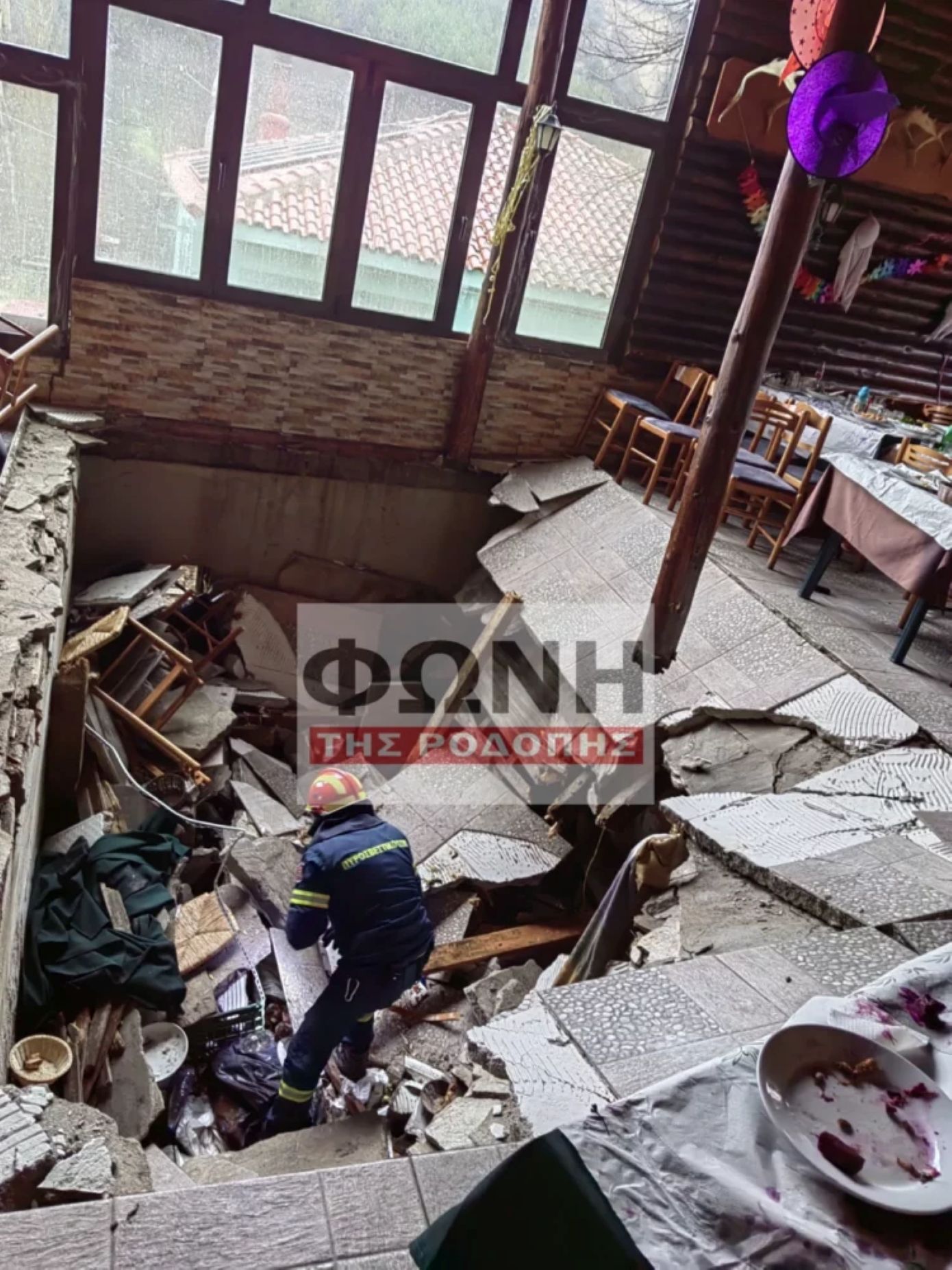 Σύμφωνα με τις πρώτες πληροφορίες, το δάπεδο τμήματος του καταστήματος υποχώρησε, με αποτέλεσμα οι θαμώνες που κάθονταν σε τέσσερα διαφορετικά τραπέζια να βρεθούν ξαφνικά στο κενό.