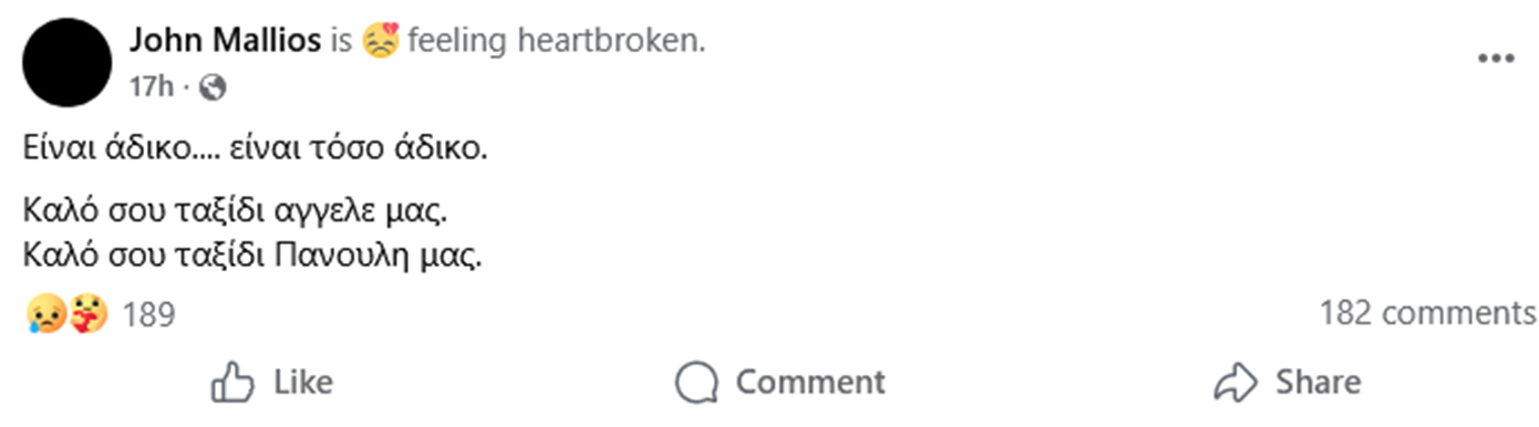 «Είναι άδικο… είναι τόσο άδικο. Καλό σου ταξίδι, άγγελέ μας. Καλό σου ταξίδι, Πανούλη μας», έγραψε.