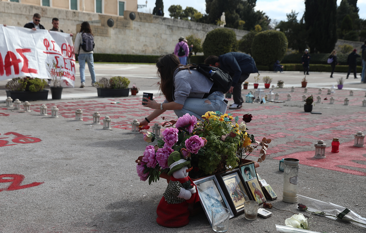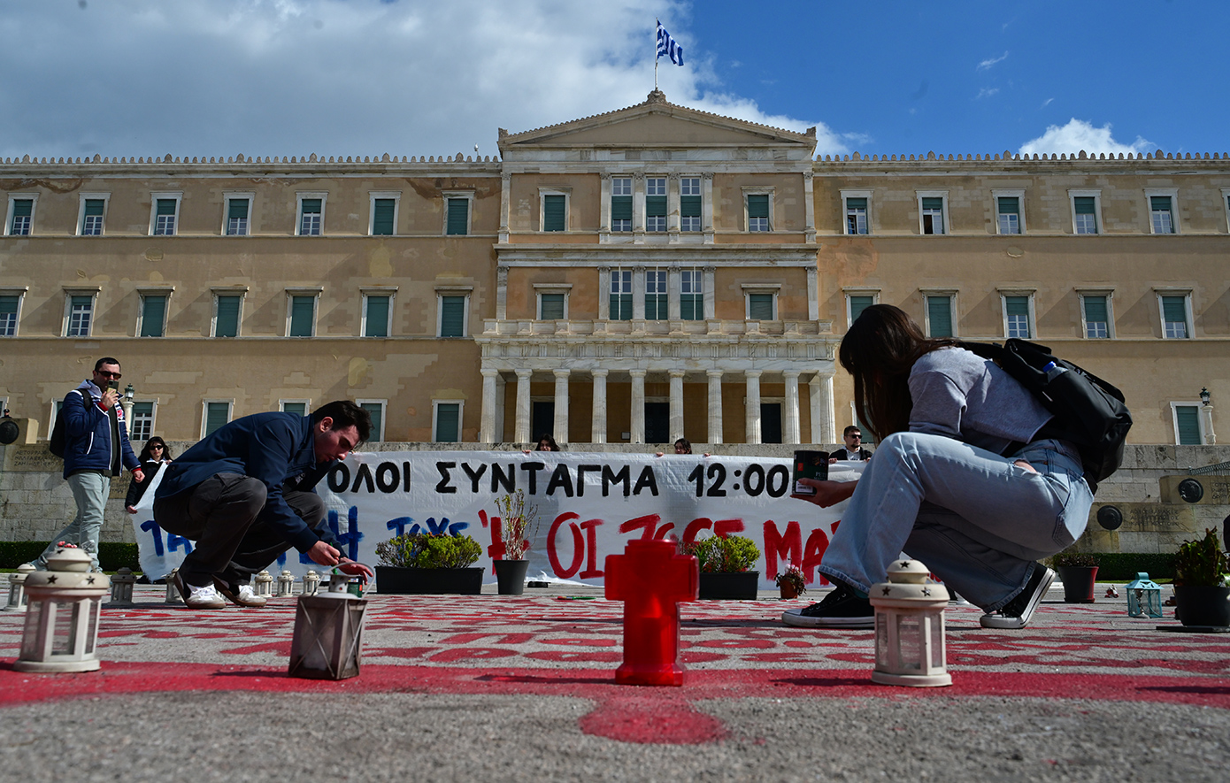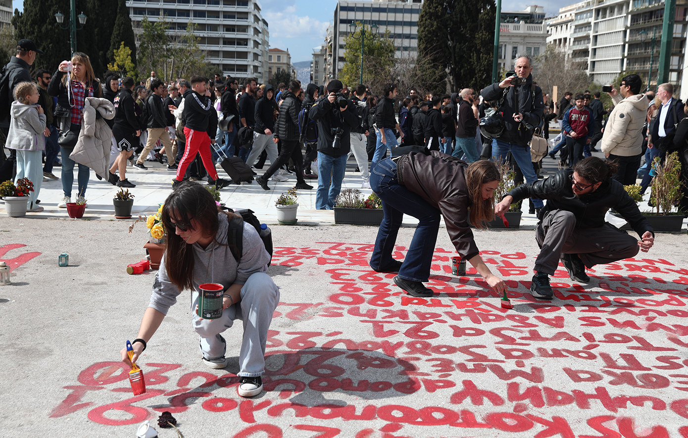 Με κόκκινη μπογιά έγραψαν ξανά τα ονόματα των θυμάτων της τραγωδίας των Τεμπών μπροστά στη Βουλή φοιτητές, κατά την άφιξη της πορείας μνήμης που πραγματοποιούν στην Αθήνα.